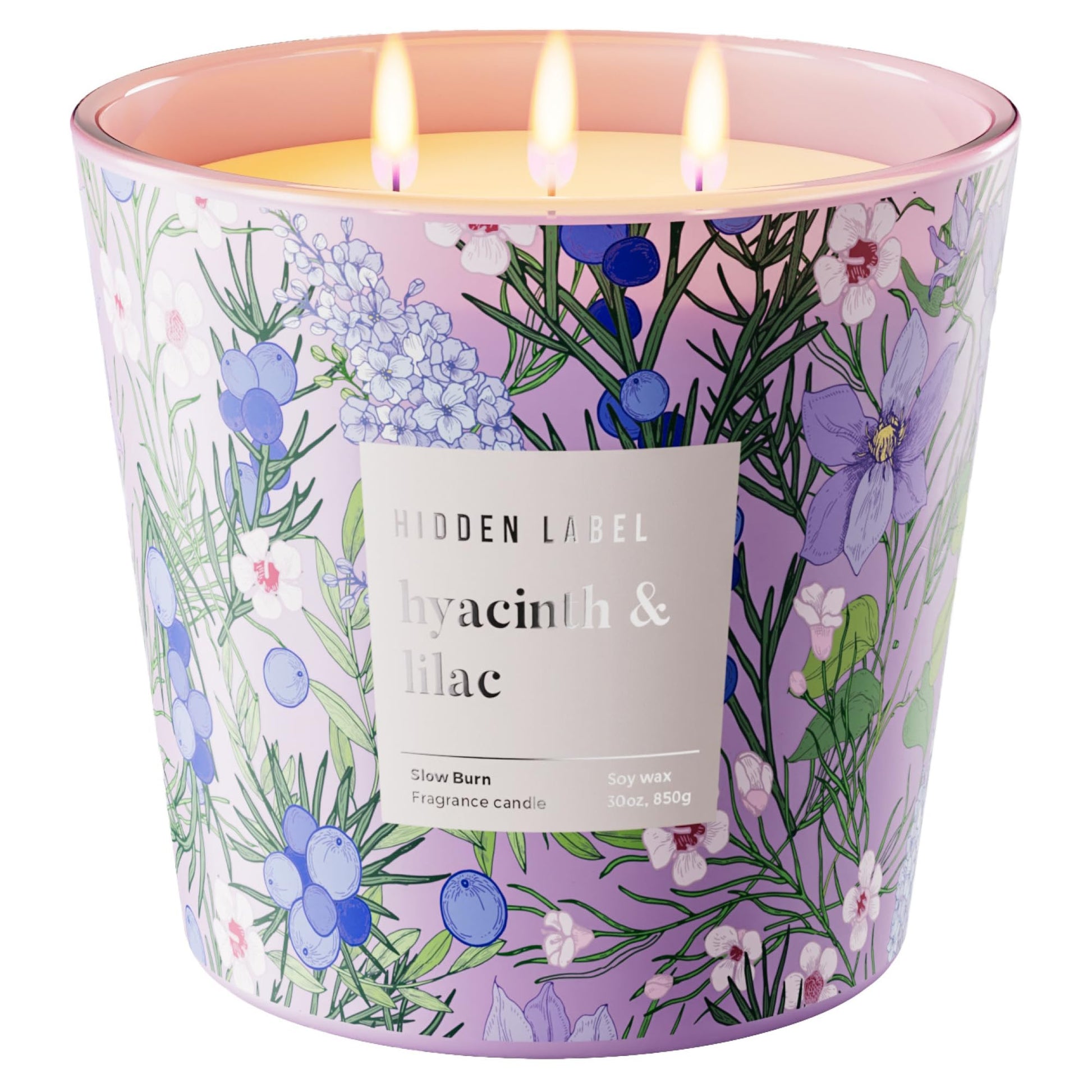 Hidden Label Hyacinth & Lilac Soy Candle, 3 Wick Large Candles for Home Scented, 30oz Natural Soy Candles Non Toxic, 100 Hour Burn Time, Aromatherapy Candle for Stress Relief, SPA, Larger Rooms