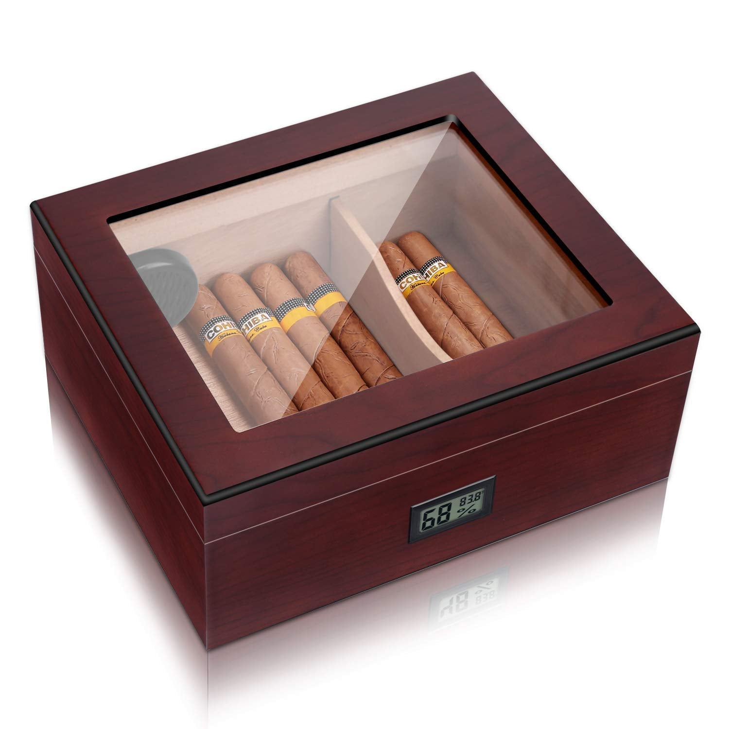 - Digital Hygrometer - We include the built-in digital hygrometer. This is the most accurate way to monitor and ensure your humidor is adequately seasoned. Showing temperature (Fahrenheit) and humidity data.
