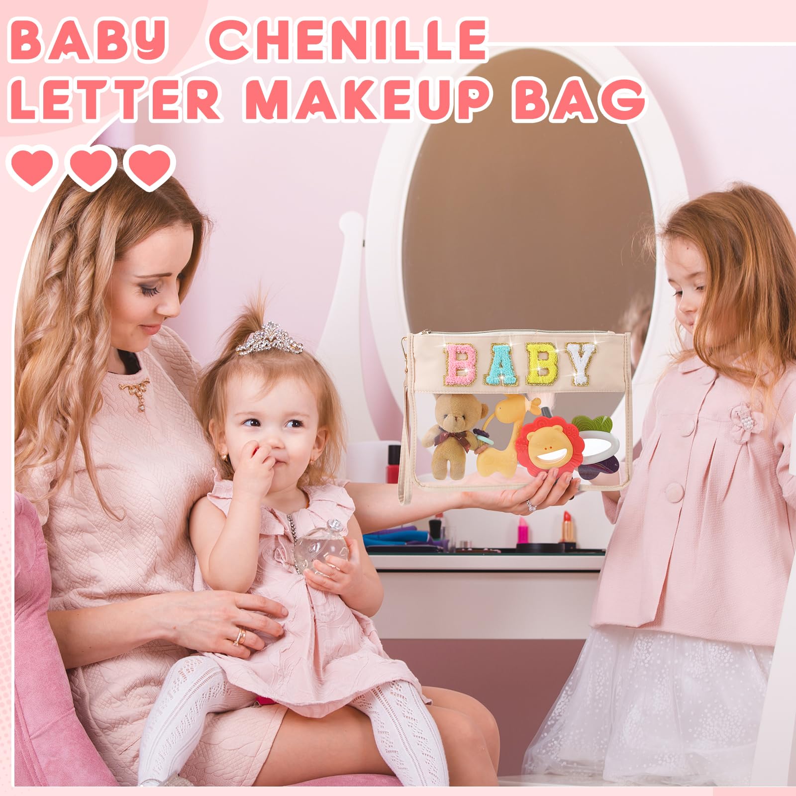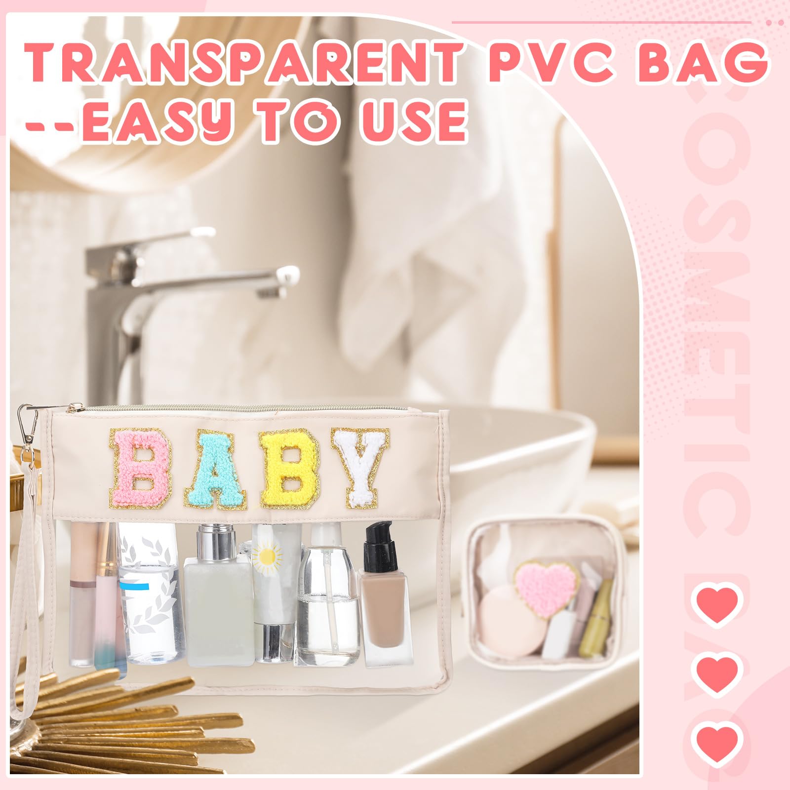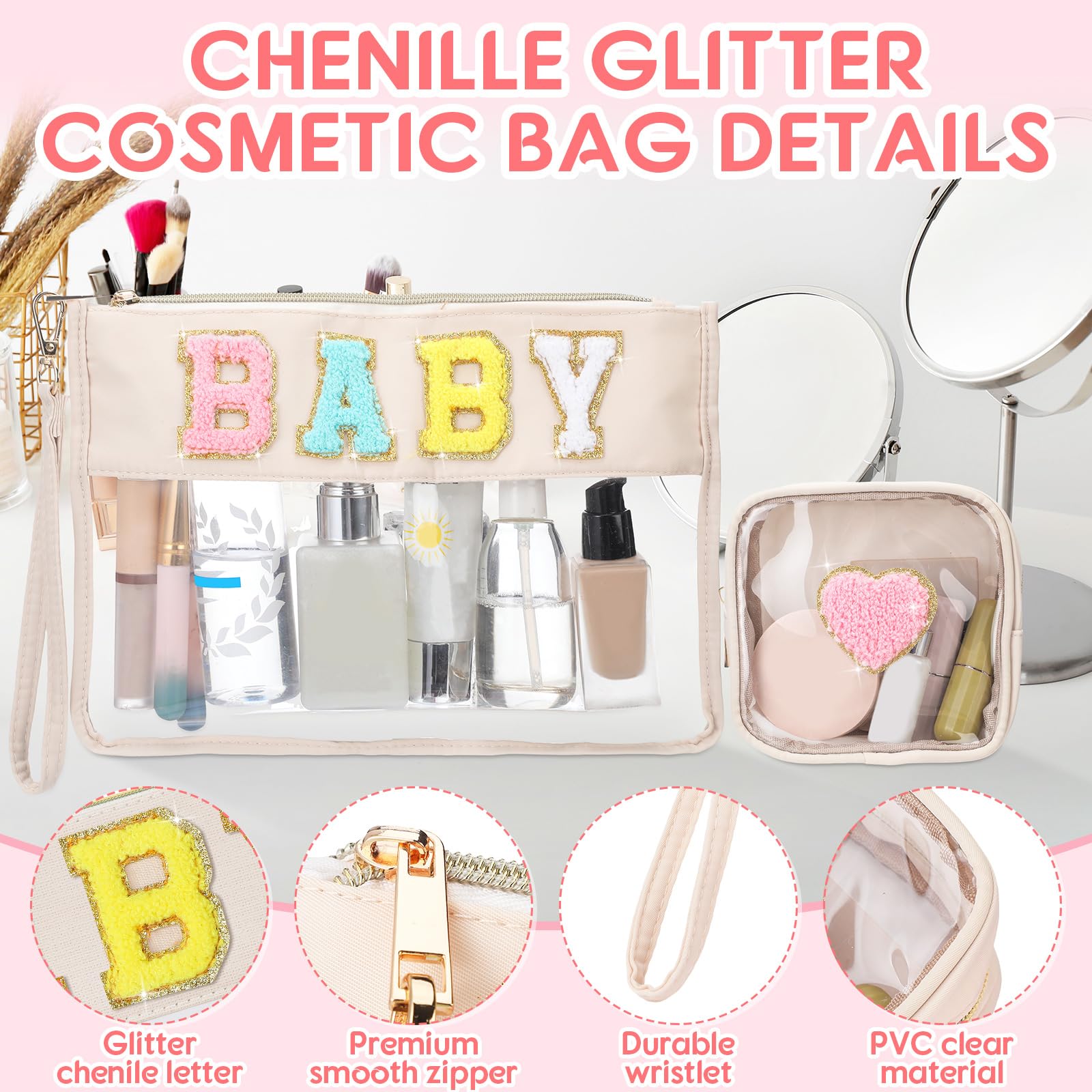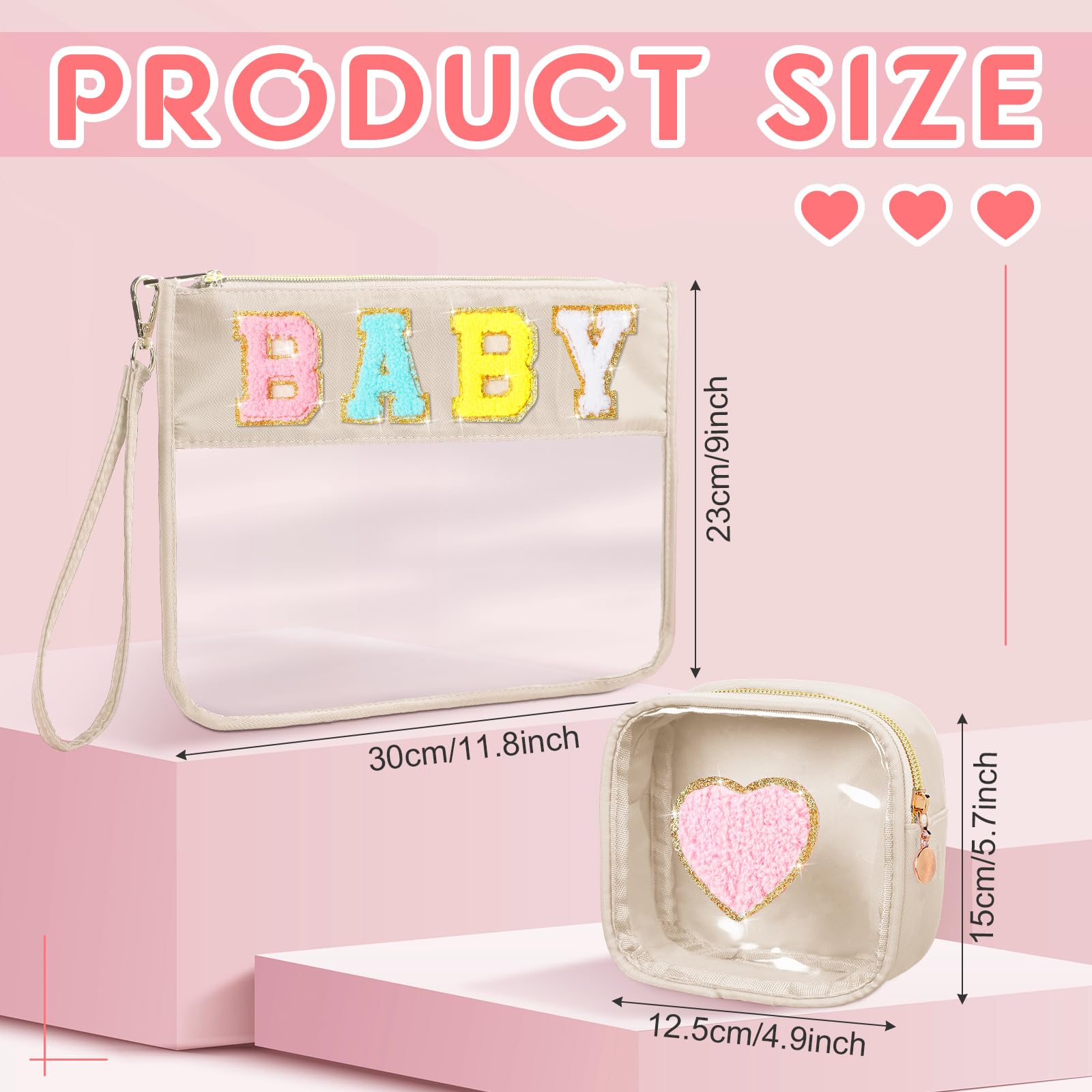 - Chenille Letter Cosmetic Bag: there are 2 pieces of preppy bags with 2 different designs, large one is firmly embroidered with the letter patch [BABY] and golden glitter border, small one is designed with a heart patch, stylish and novel appearance is favored among women