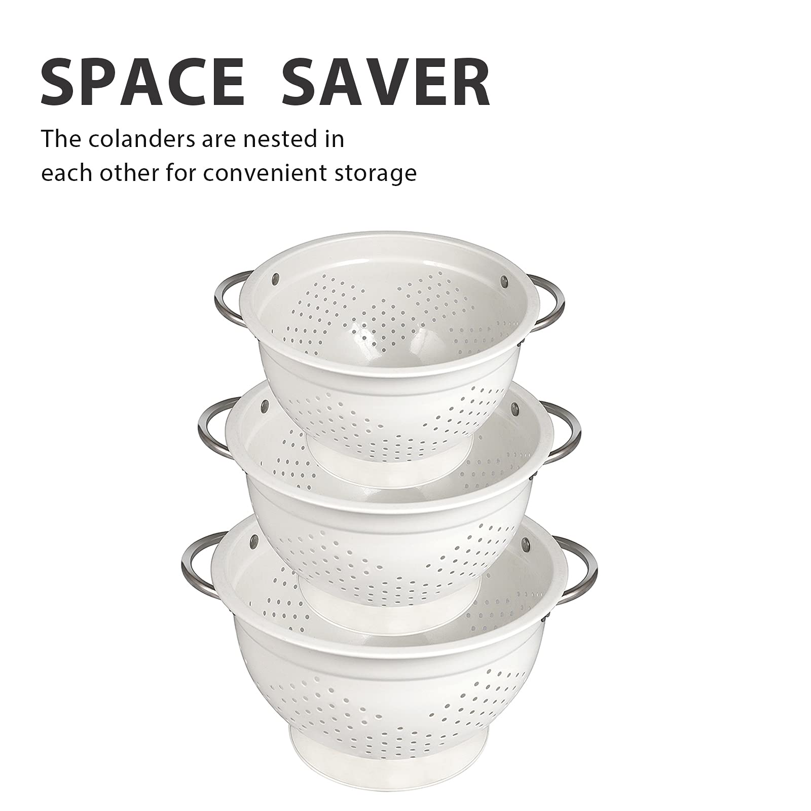 - Multi Size & Space Saving: Hillbond 3-piece colander for kitchen add convenience to your kitchen. With different sizes of 1.5, 3 ,5 Qt, you can easily clean and drain pasta, noodles, potatoes, tomatoes, berries and all other vegetables and fruits as needed. Compared with other colanders, our stainless steel colander strainer set has an advantage in saving space because of the bowls can be nested seamlessly