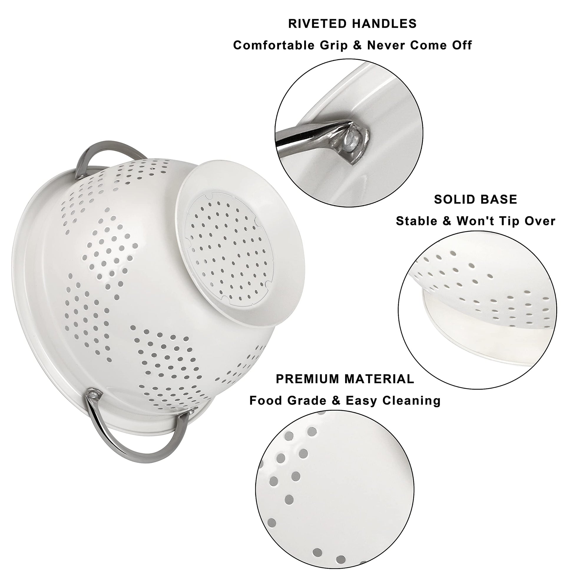 Hillbond Colander Set of 3, 1.5, 3, 5 QT Powder Coated Metal Strainers with Riveted Stainless Steel Handles and Stable Base, Food Strainers and Colanders for Kitchen, White