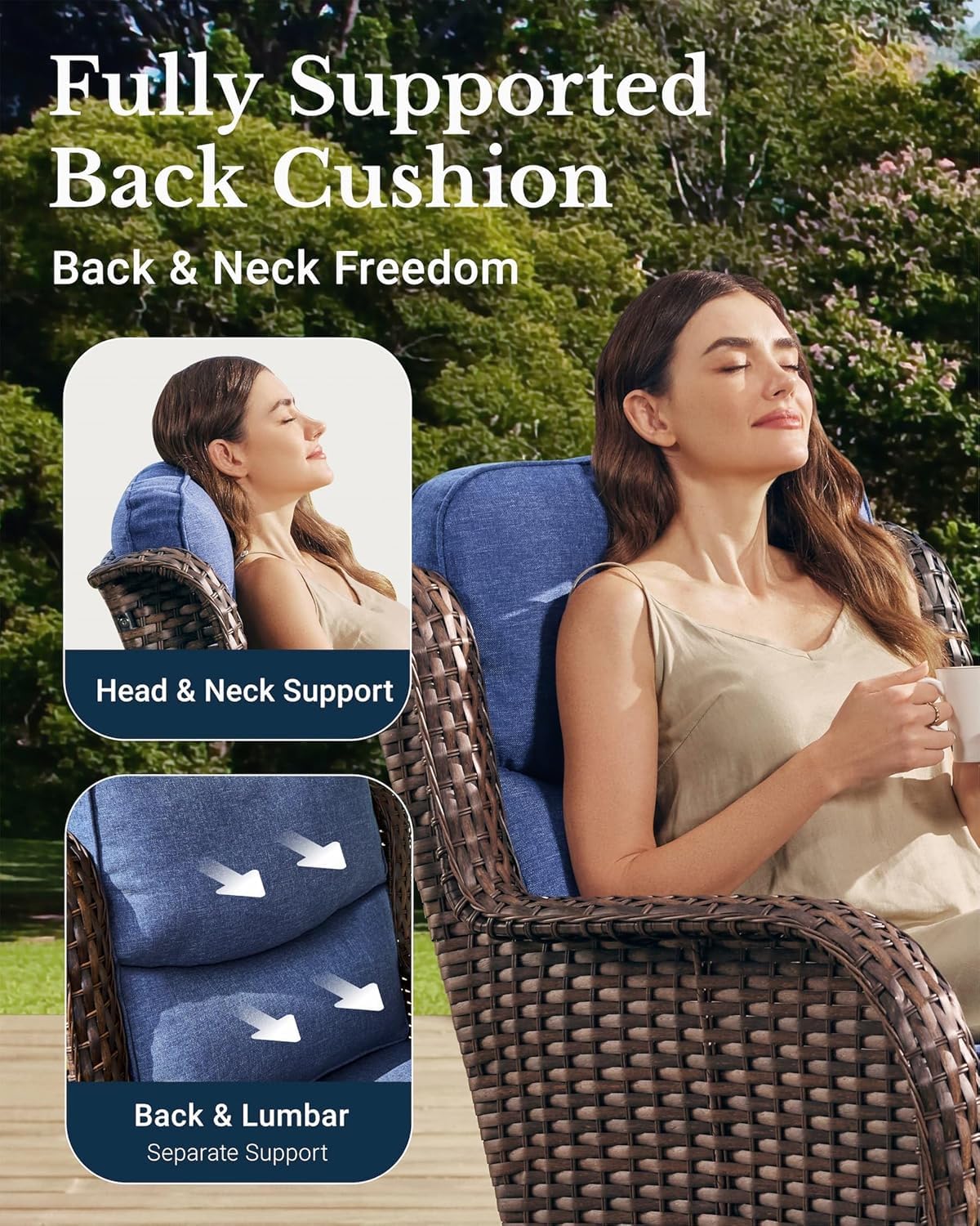 - LUXURY & COMFORT CUSHION: Normal was never good enough. The 6-inch cushions of the patio rocker swivel chairs feature the high-density 28D foam, striking the ideal balance of softness and support, with a quick-rebound feature that maintains lasting shape and comfort. Inside the cover, a soft cotton layer wrap is added to offer extra cushioning and protection while the backrest is enhanced with 3D space cotton for excellent pressure relief. Sink into and enjoy cloud-like comfort, intuitive support, and exceptional softness