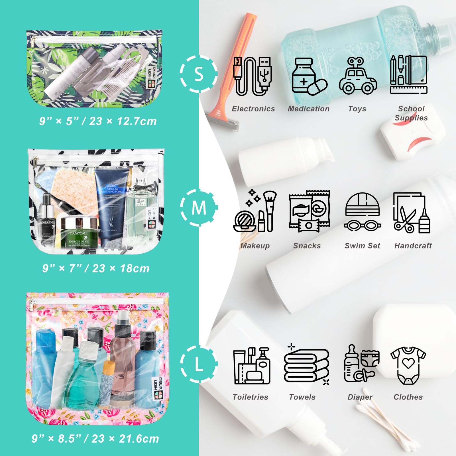 - TSA APPROVED: Always stuck in check point and waste more time?Get our tsa approved toiletry bag and experience a smoother screening process,travel with ease.TSA compliant for our travel toiletry bag to avoid repacking in awkward situations.Save your time and no more hold-ups or hassles at each point like airport,stadium,park,etc.You can quickly pass through the security screening and easily get items anytime.The set includes Large: 9' x 8.5' Medium: 9' x 7' Small: 9' x 5'.Good to go anytime!