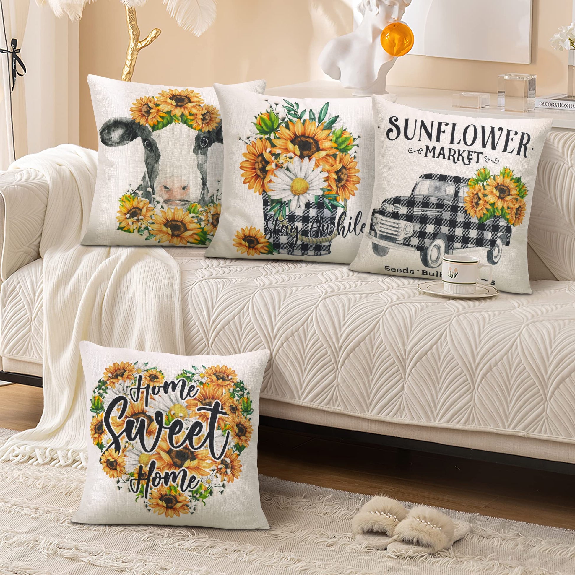 Hofomca Spring Summer Sunflower Throw Pillow Covers 18x18 Set of 4,Yellow Flowers Cushion Case Farmhouse Black and White Cow Buffalo Plaid Pattern Home Decorative for Couch Sofa Outdoor Living Room
