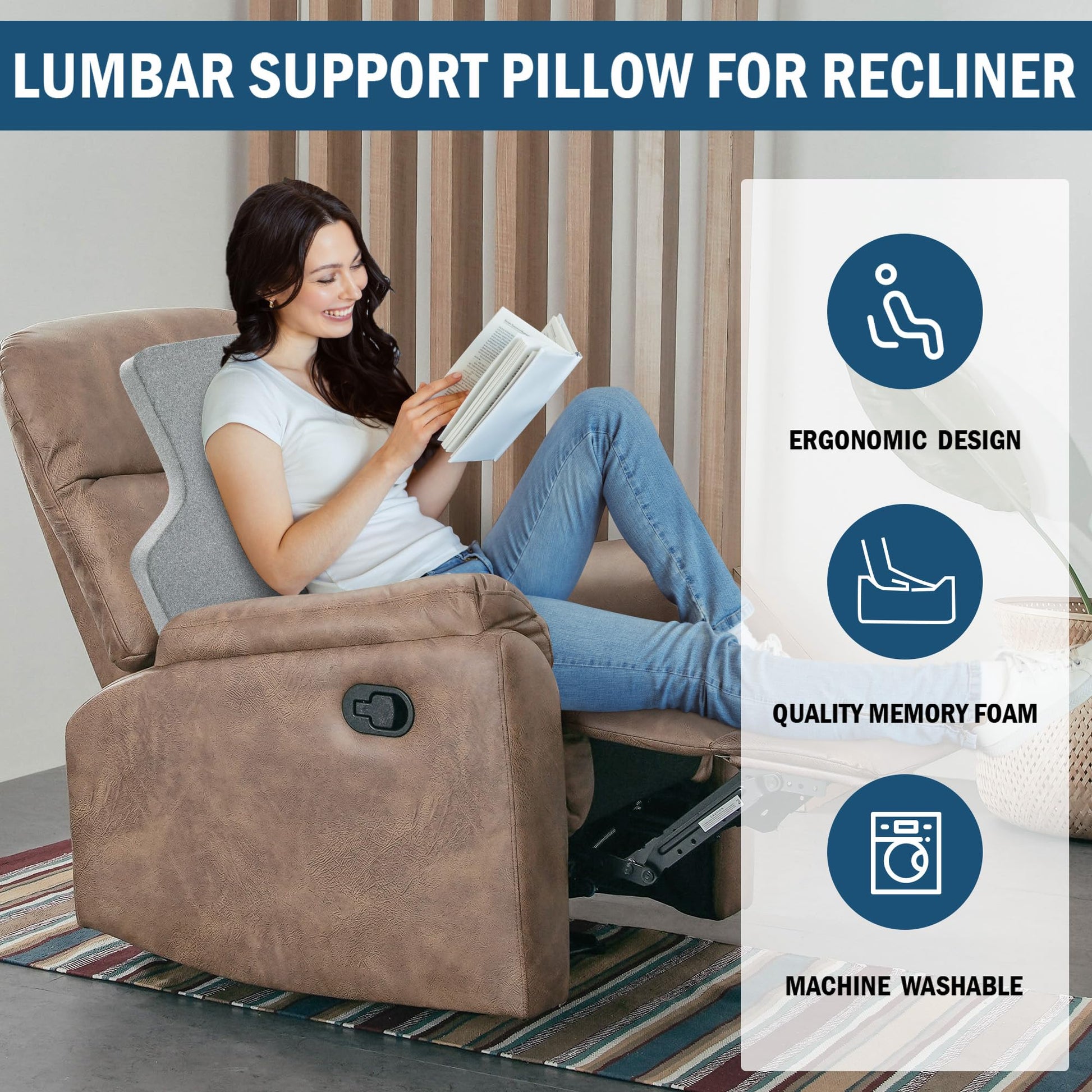 - 【Designed for Recliner】Measures 20'x21.7'x3' , The widen and thicken sides cover around your entire waist and lower back. Perfect Size Supports the Entire Back,the recliner lumbar pillow is designed to fits your recliner、Armchairs and Couches. allowing you to feel relaxed and at ease.