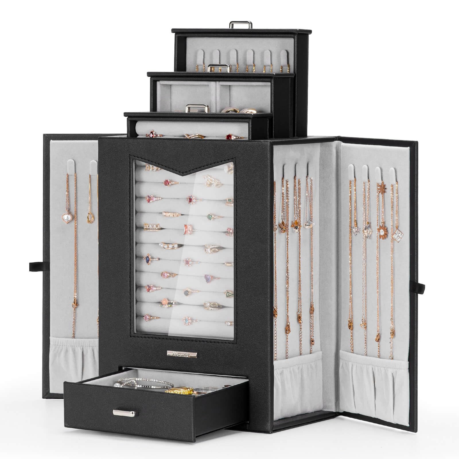 - Rustic and Elegant: The jewelry organizer is made of chic black PU-leather, with a soft grey flannel lining to bette