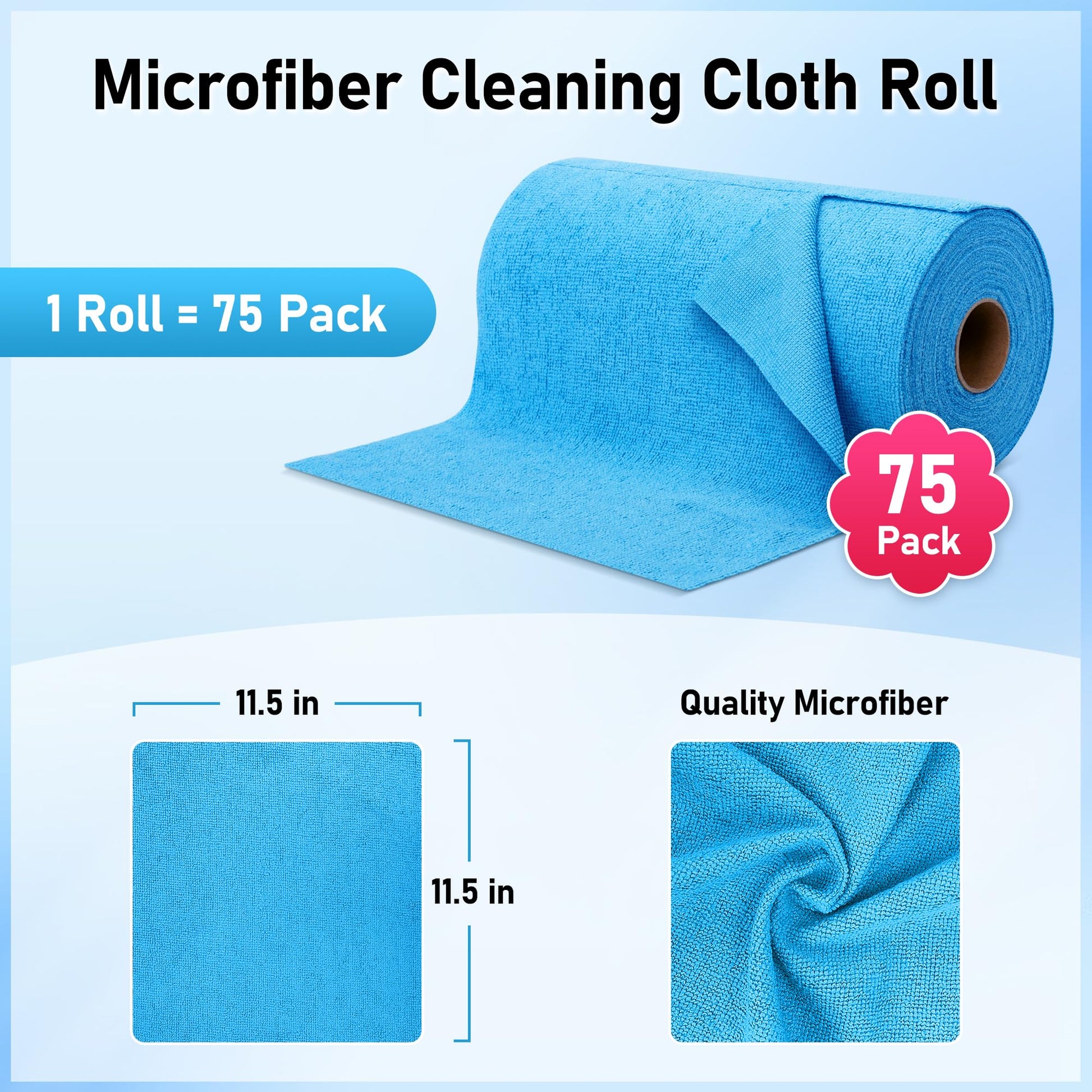 - SPECIAL TEAR-AWAY DESIGN: These microfiber towels come in perforated rolls like paper towels, with a perforation you can easily tear them off. Each microfiber cleaning cloth roll includes 75 sheets of towels, they fit on most paper towel holders. These are durable enough for reuse but are economical enough to not worry about tossing if they get too funky or your mess is really bad. You can easily dispense and handle individual sheets for cleaning tasks.
