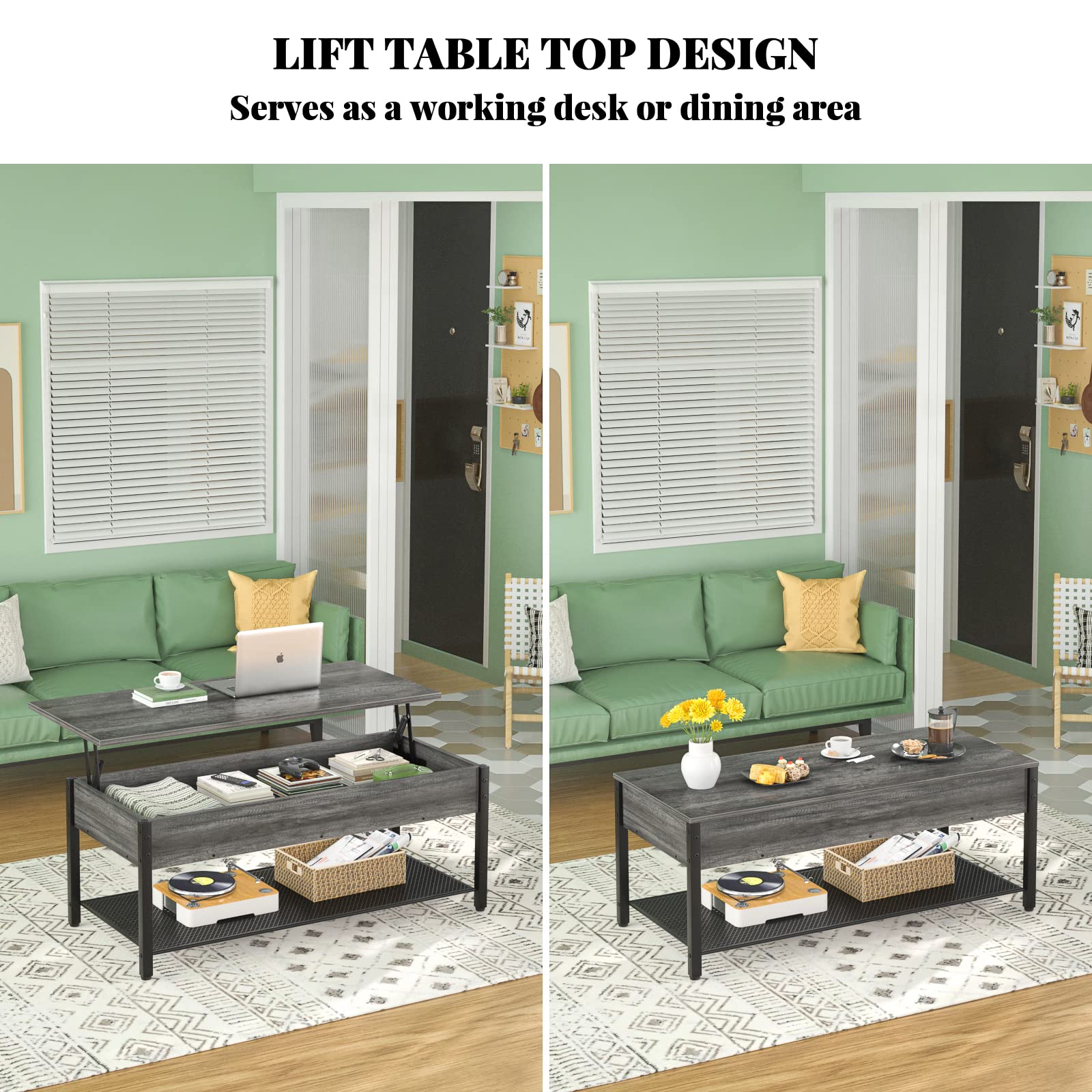- Convenient Lift Top Design - This coffee table features a unique lift-top design that allows it convert easily to serve as a desk or compact dining table while relaxing on your couch. You can easily enjoy using a laptop or eating in front of the lift top coffee table as it's just the right height!