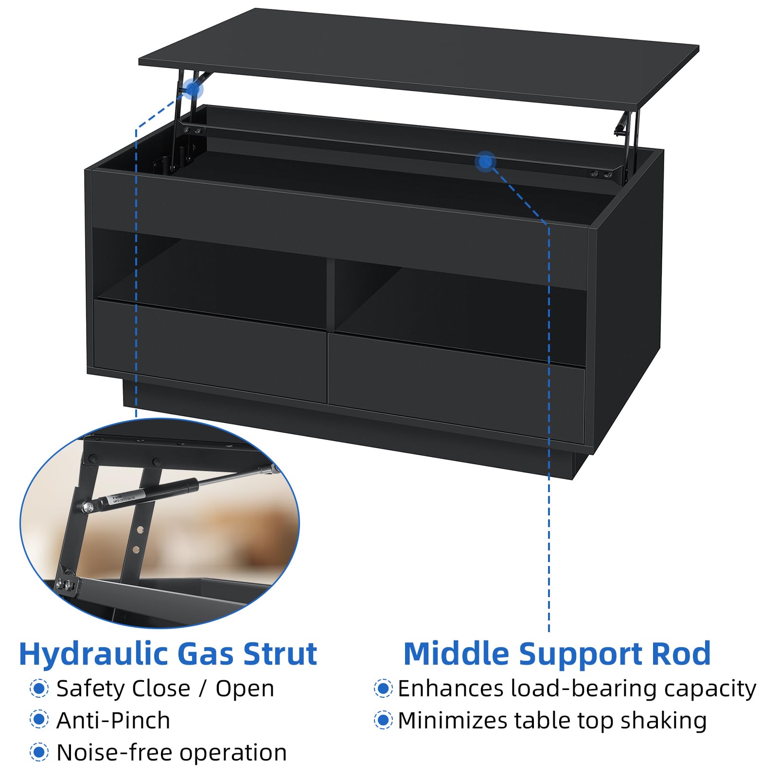 HOMMPA 40‘’ LED Coffee Table for Living Room, Lift Top Coffee Tables with Storage, Morden High Gloss 4 Tiers Black Tea Table Center Tables with Hidden Compartment & 2 Open Shelve & 2 Drawers