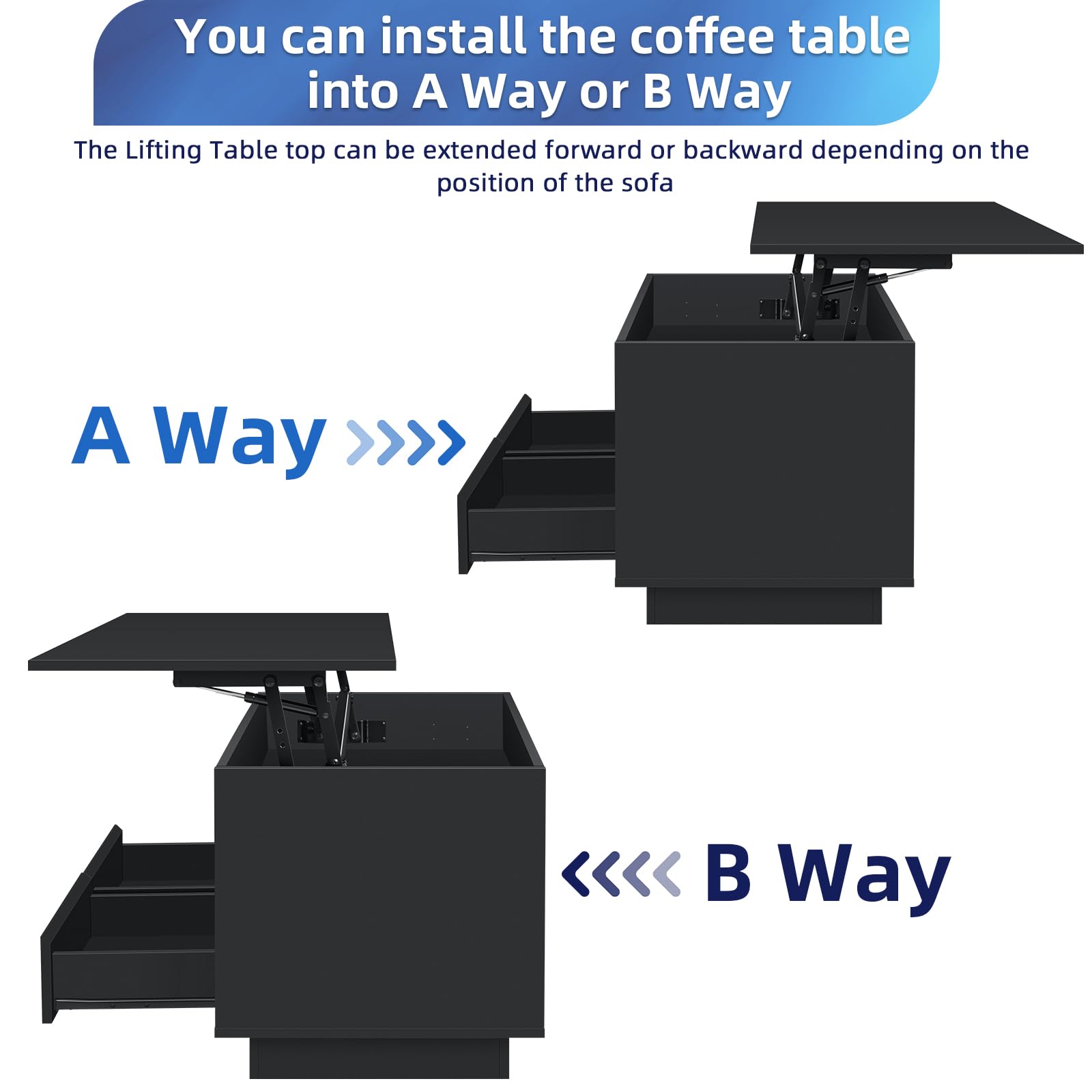 - 【2-in-1 Lift Design】Black coffee table has an extended lift top, Built with gas struts for effortless lifting and lowering of the table top ranging from 19.29' to 25.2'. When lifting up, it becomes a dining or gaming coffee table, also it becomes a workstation for you; when lifting top is closed, modern coffee table is suitable for storing sundries.