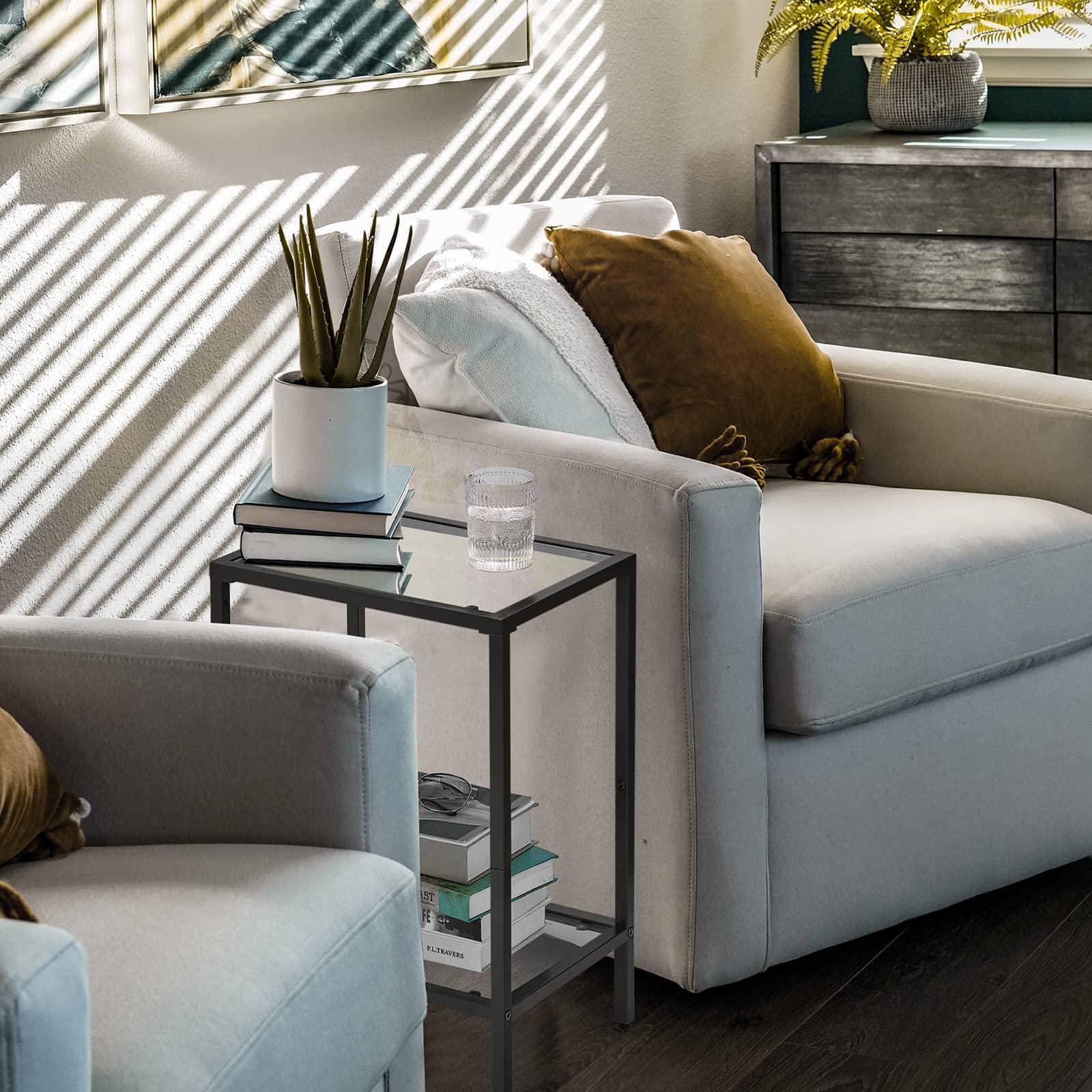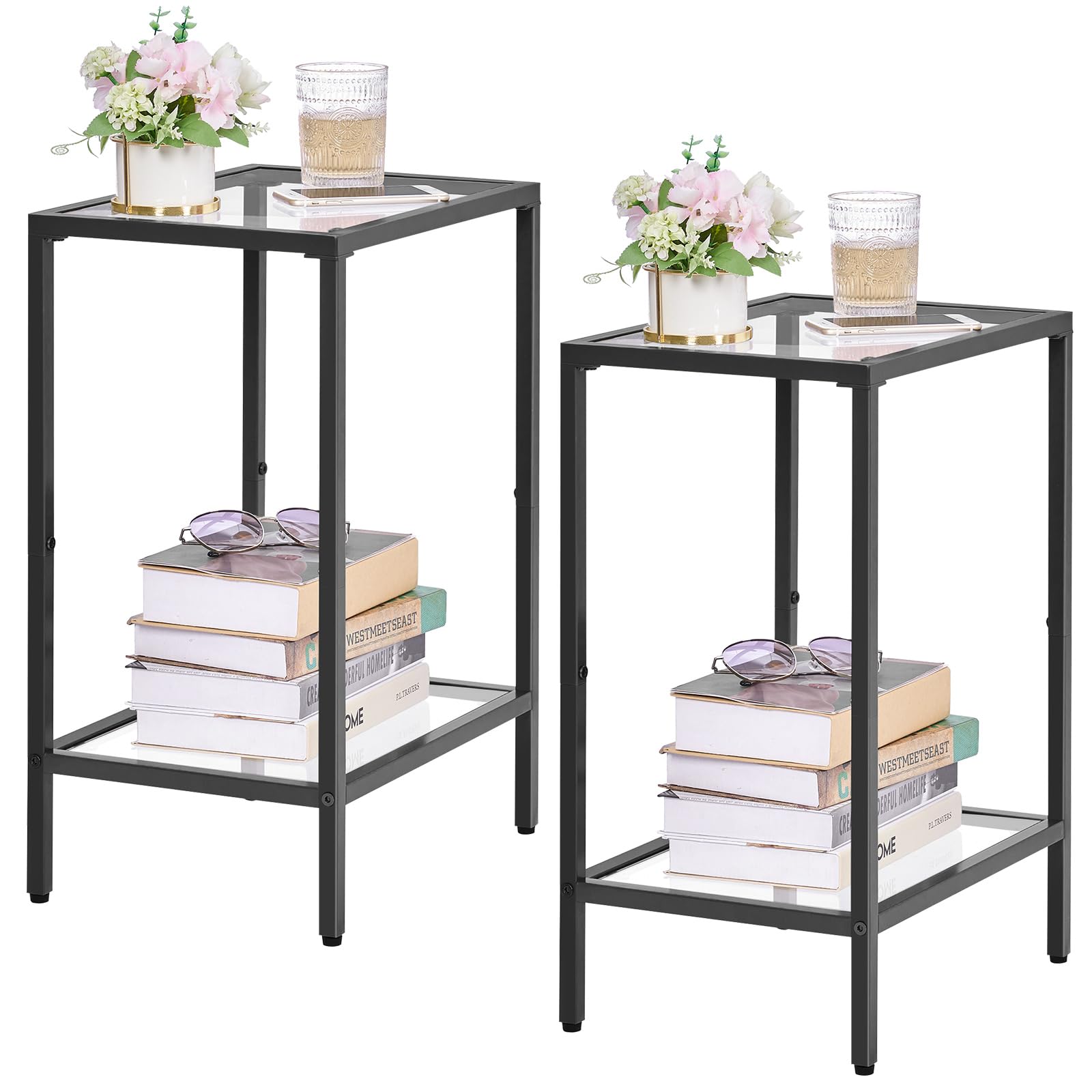 HOMSHO Side Tables Set of 2, End Tables with Tempered Glass, 2-Tier Nightstands with Storage Shelves, Coffee Table with Modern Style, Slim Sofa Table for Living Room, Bedroom, 11.8" D x 15" W, Black