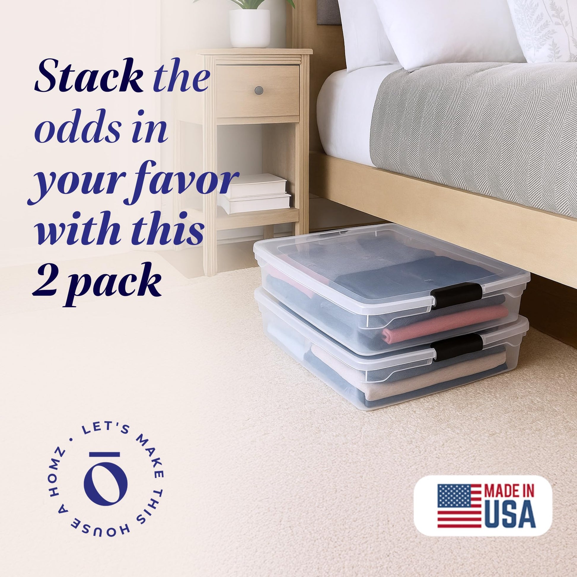 HOMZ 2-Pack Under Bed Storage, Clear Plastic Containers with Lids, 56 Quart, Gray Latch - Stackable Underbed Organizer Bins for Shoes, Bags, Clothes, and Towels