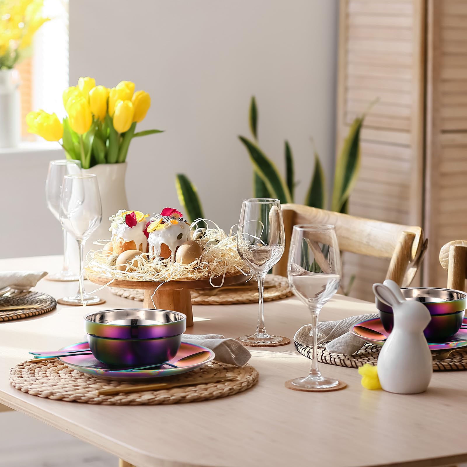 - Exquisite Craftsmanship: this rainbow tableware set with colorful shinning look, quality titanium rainbow coating, it enhances surface hardness to reveal both artistic and safety, mirror polished finishing, smooth surface and edges, extremely serviceable and easy to maintain, don't worry the color fading or peel off