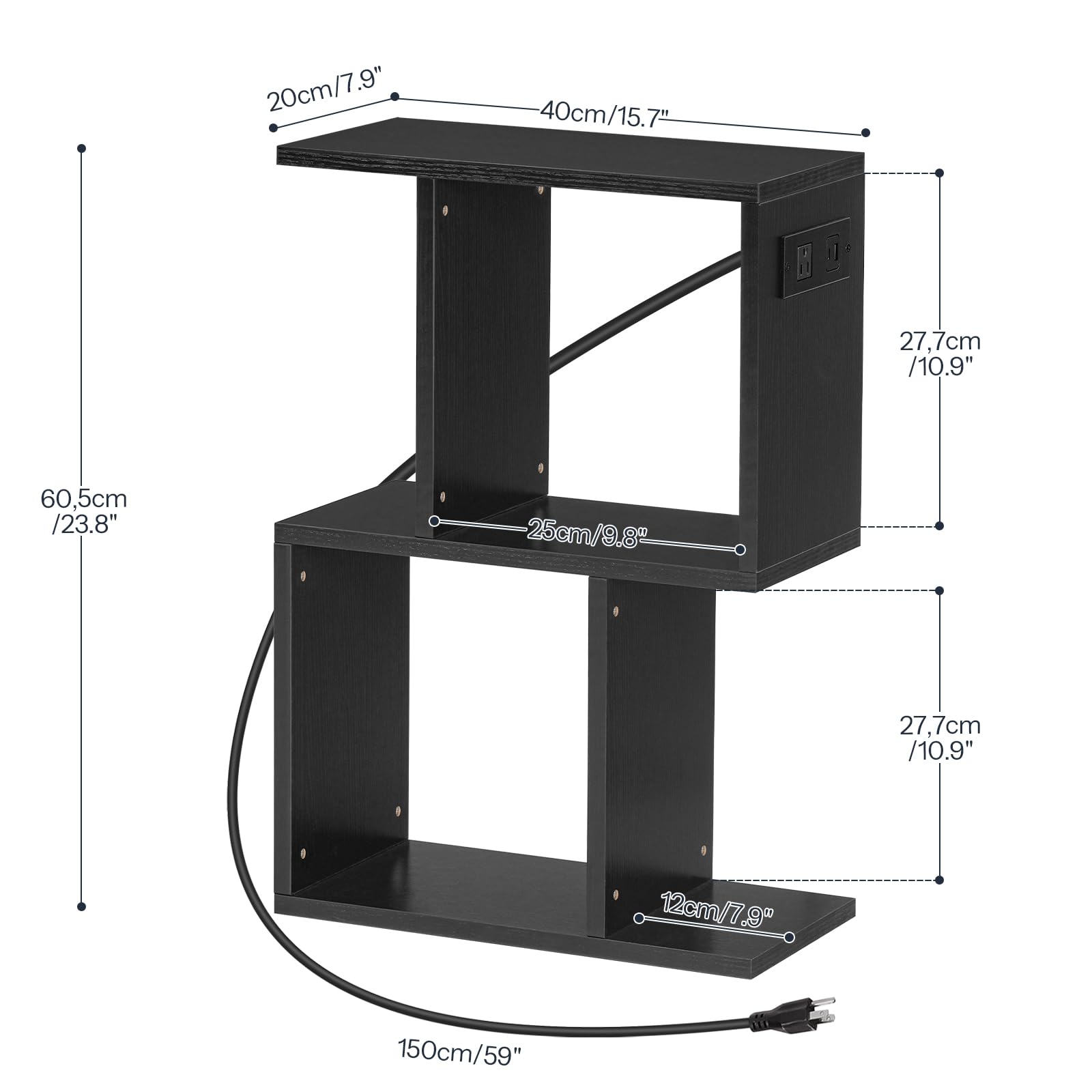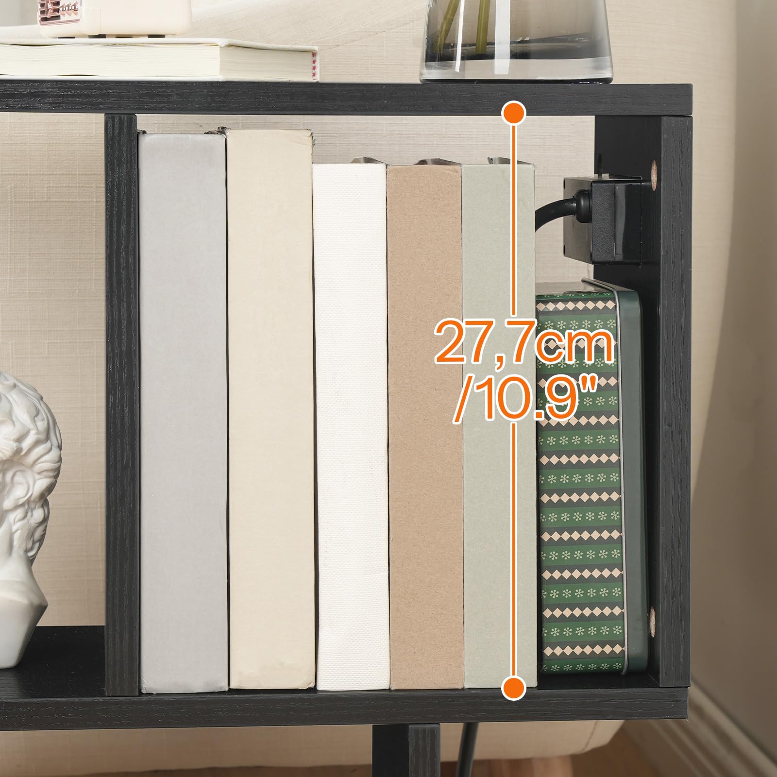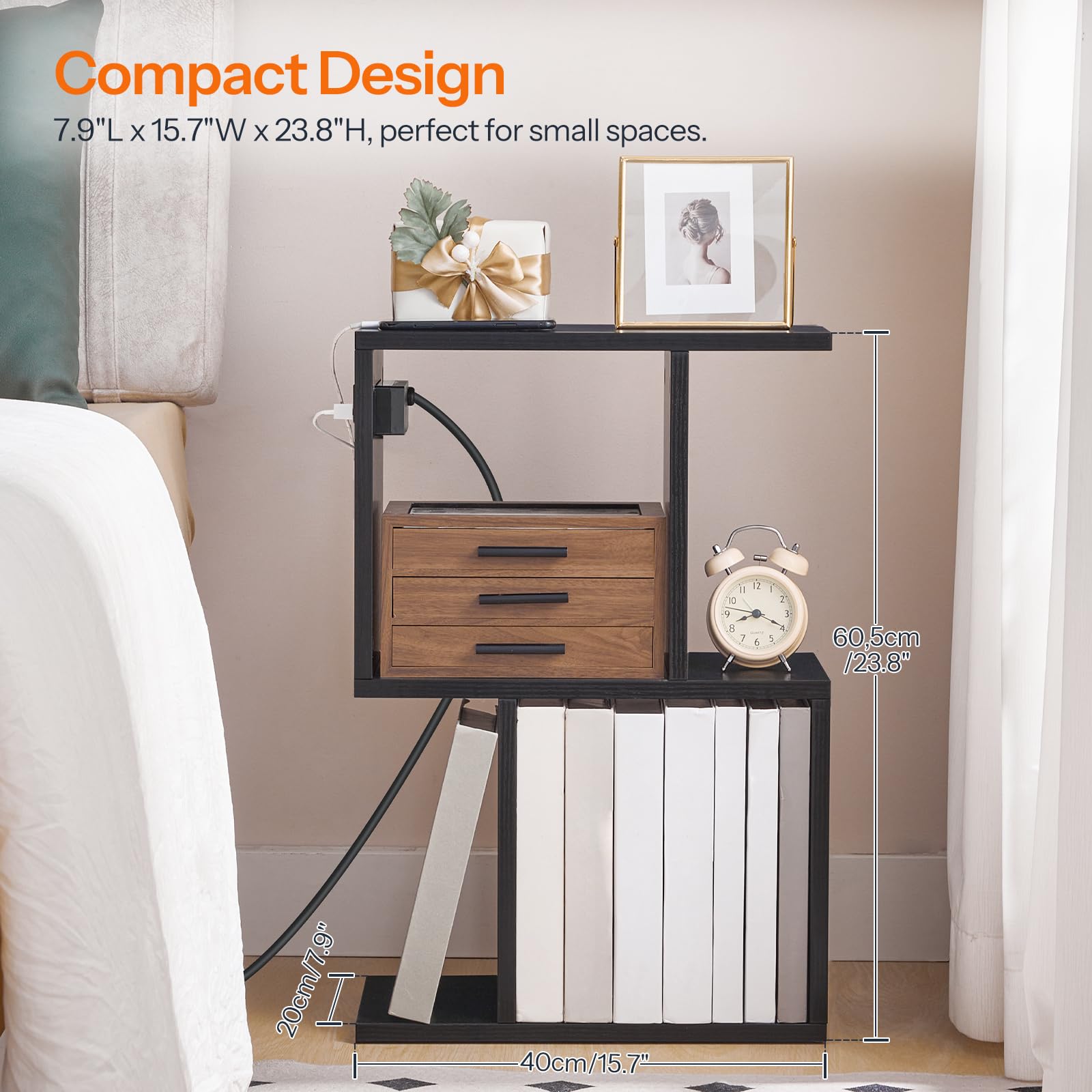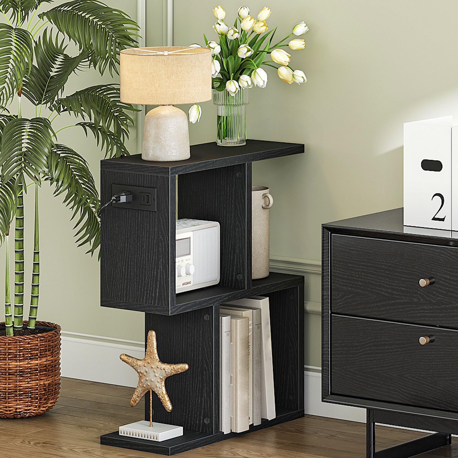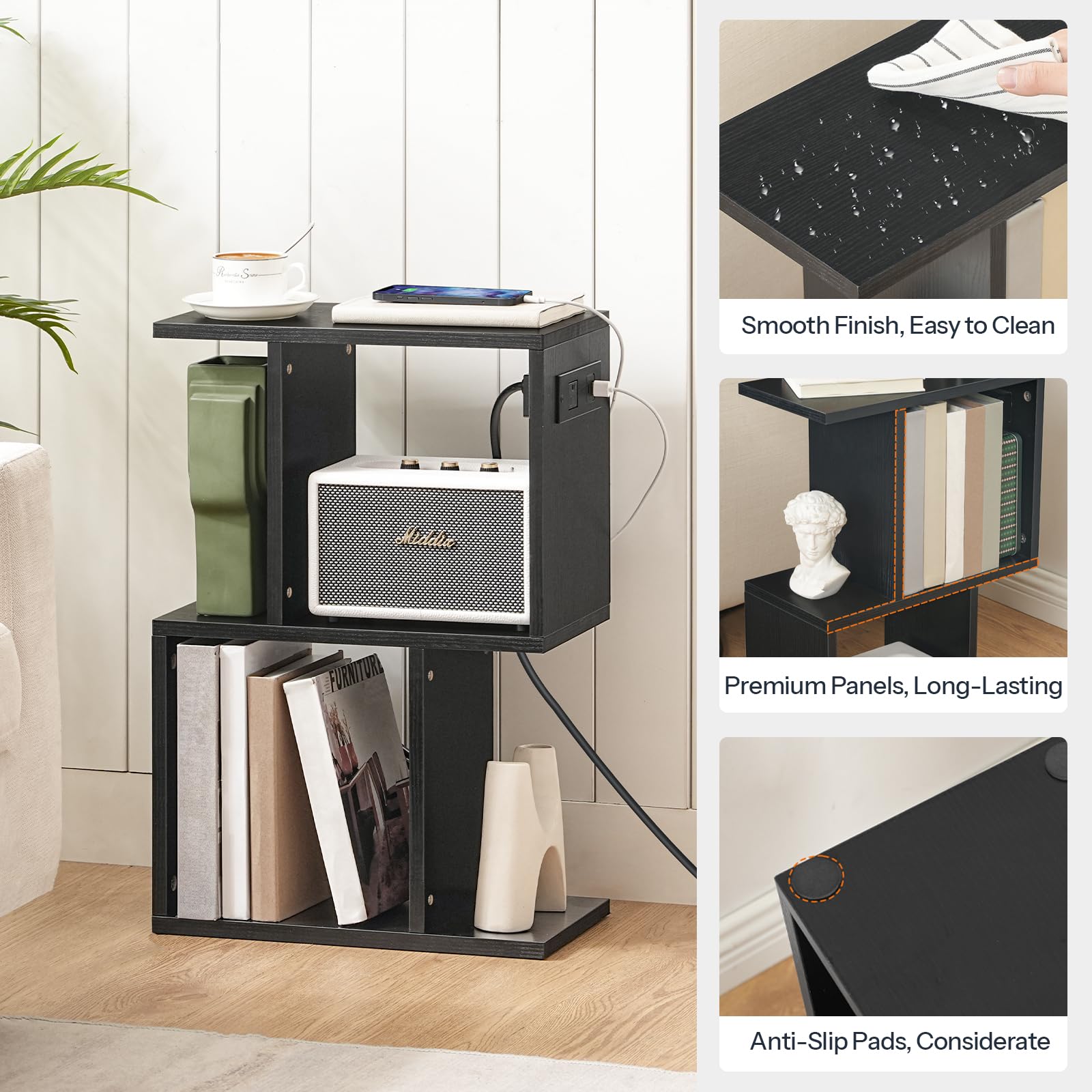 HOOBRO Narrow Side Table with Charging Station, S-Shaped Slim End Table Geometric Bookshelf with Open Storage, for Small Space, Living Room, Bedroom, Rustic Brown FG137UBZ01