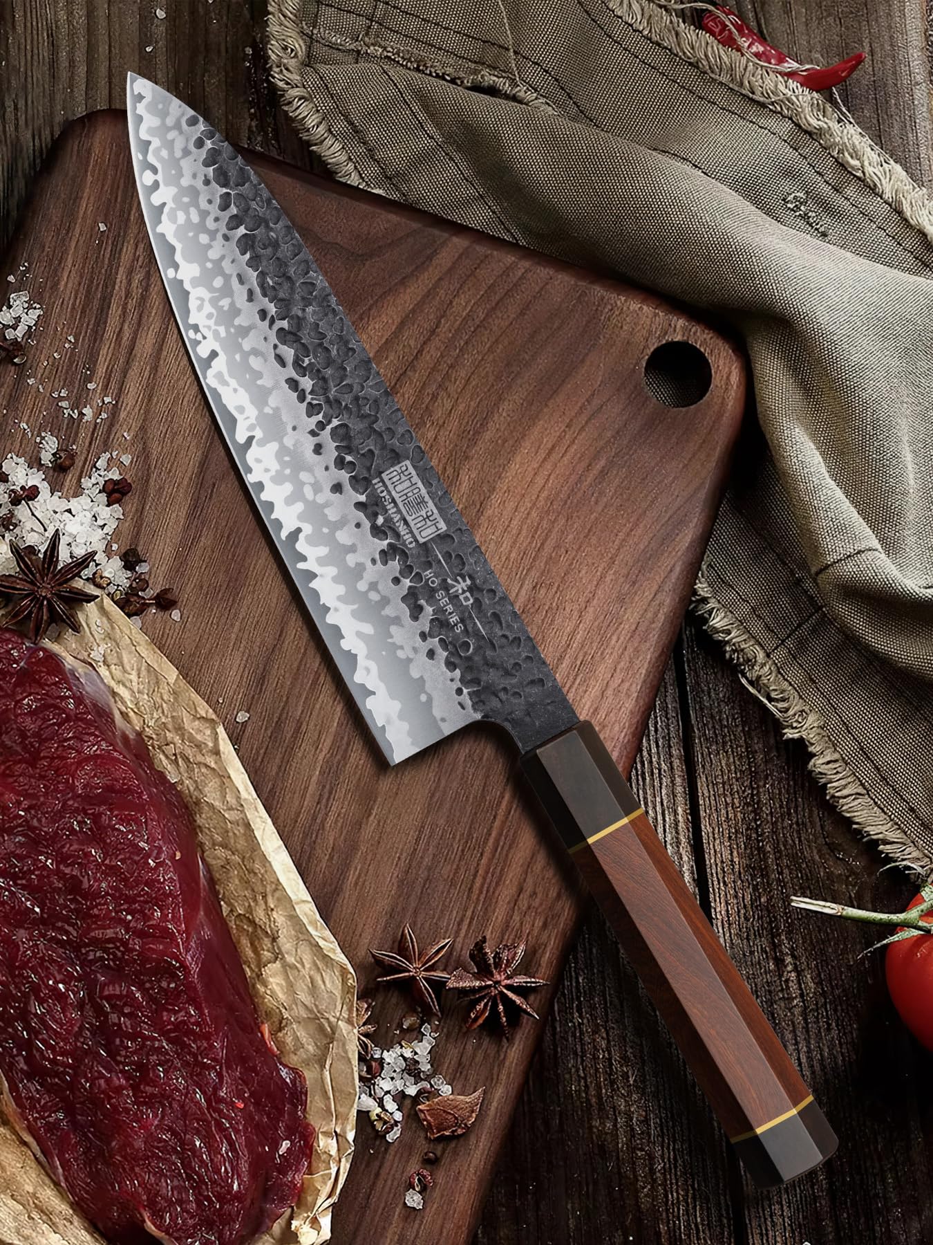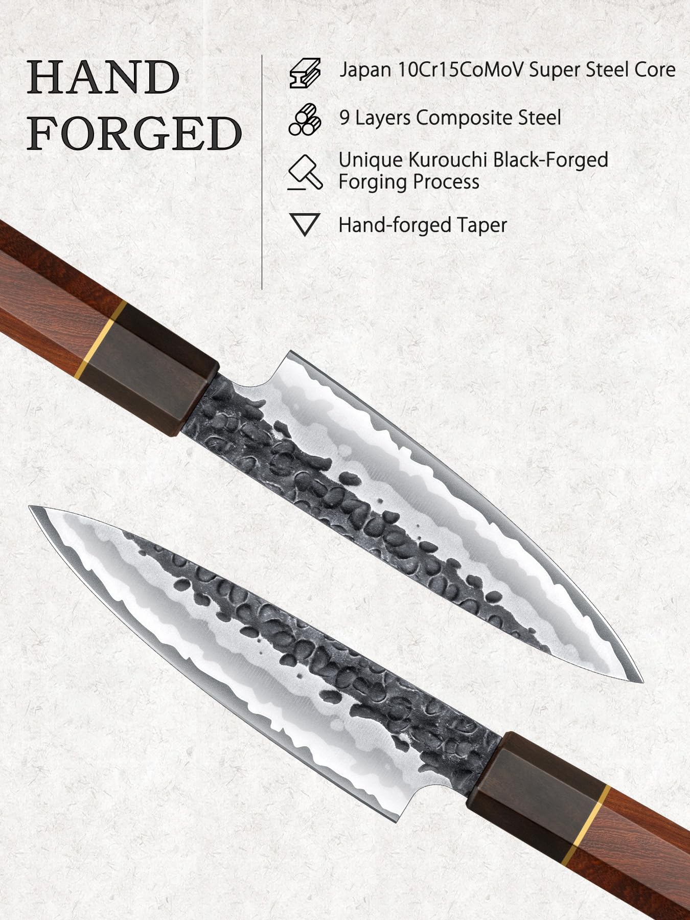 - 【Japanese High Quality Steel】This chef knife set line is one-piece, hot-drop hammer forged, which produces the strongest blade from heel to tip; Blades are heat treated and cooled to achieve a rockwell of 60+, possessing great hardness and unparalleled toughness
