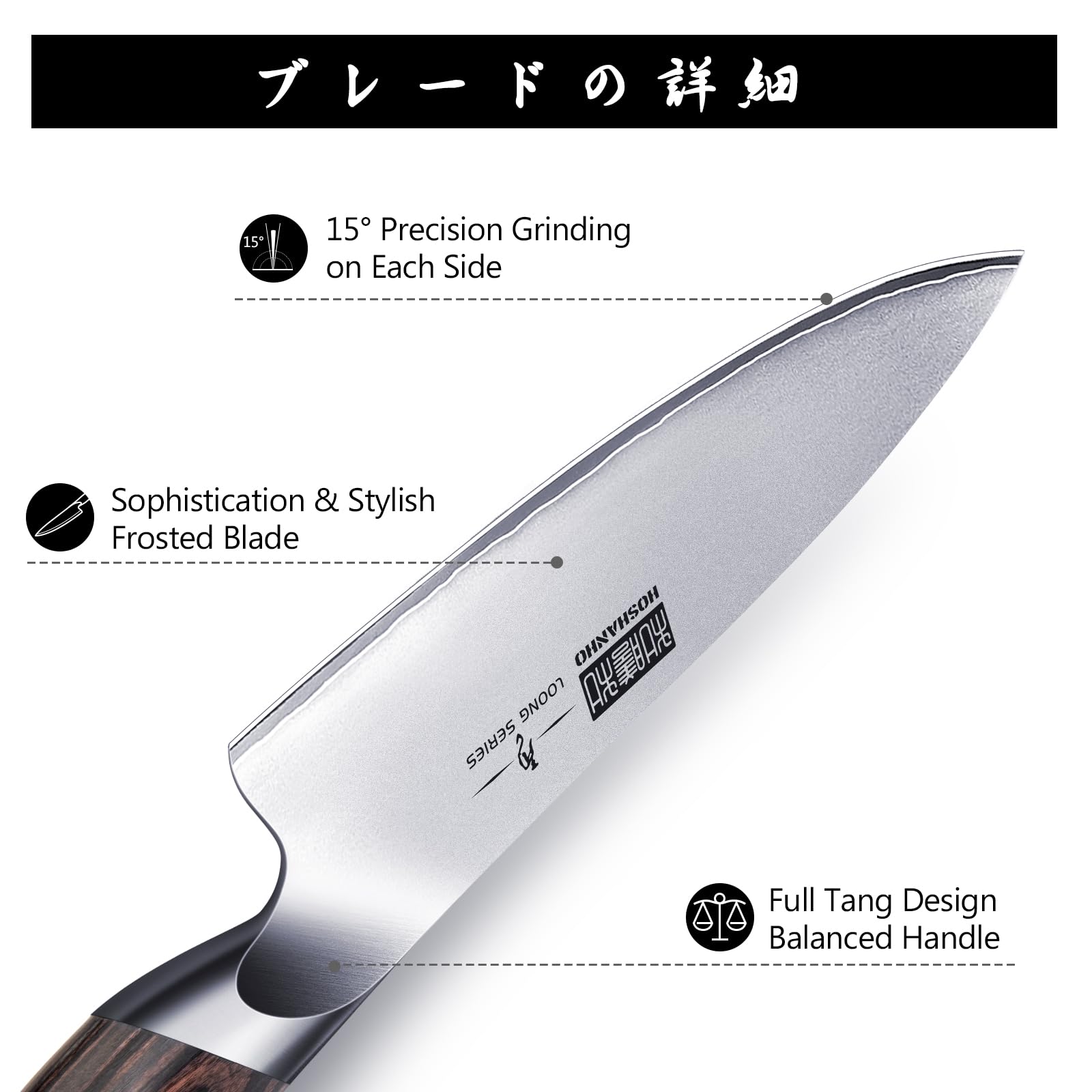 - 【Upgraded Steel Core】HOSHANHO 5 Pieces kitchen knife set is made of Japanese 10Cr15CoMoV high carbon stainless steel, which has undergone a precise heat treatment process to make the hardness as high as 58+2 HRC. This top-grade material ensures excellent durability, allowing the meat knive to maintain excellent performance even after long-term use.