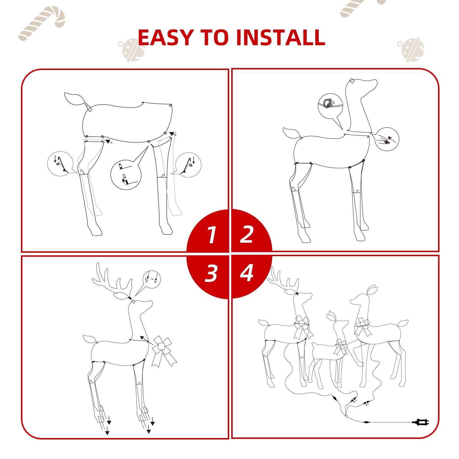 - Elegant Details: Each lighted reindeer features a sparkling bow and warm glow, creating a cozy holiday atmosphere. Buck: 28'(L) x 8.5'(W) x 48'(H); Doe: 28'(L) x 8.5'(W) x 43'(H); Fawn: 21.5'(L) x 5'(W) x 28'(H).