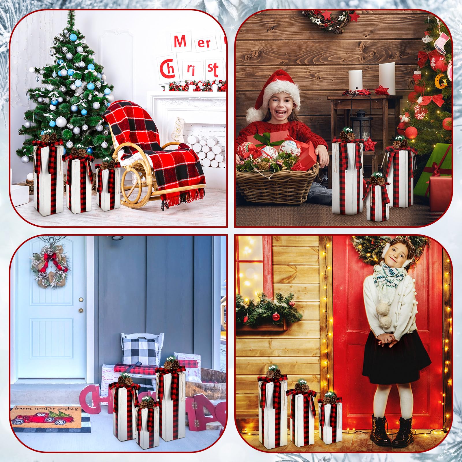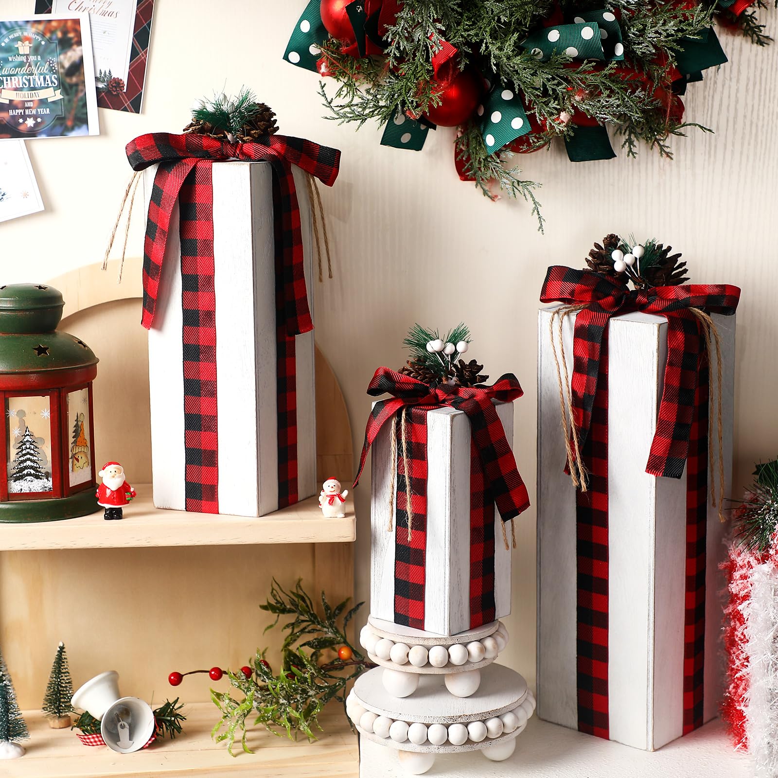 Huwena 3 Pcs Large Christmas Rustic Wood Presents 3 Sizes Christmas Table Centerpieces Christmas Tiered Tray Decor Gift Christmas Xmas Decor Wooden Faux Blocks with Buffalo Plaid Bowknot for Holiday