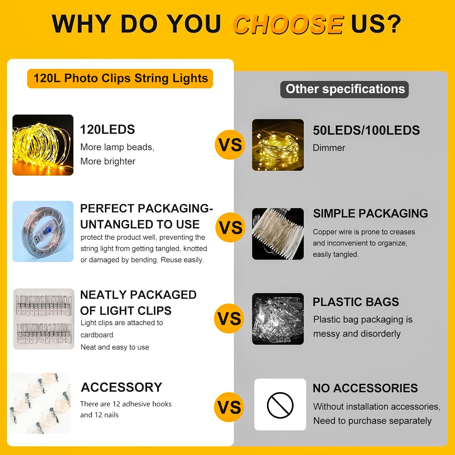 - Upgrade 120LED Photo Clips String Light: Our Copper Wire Fairy String Light have 120LED; Total 40ft long with extra 10ft long power cord; And 10cm distance between LED bulbs, allowing you to free adjustment any sizes on the led string lights for picture