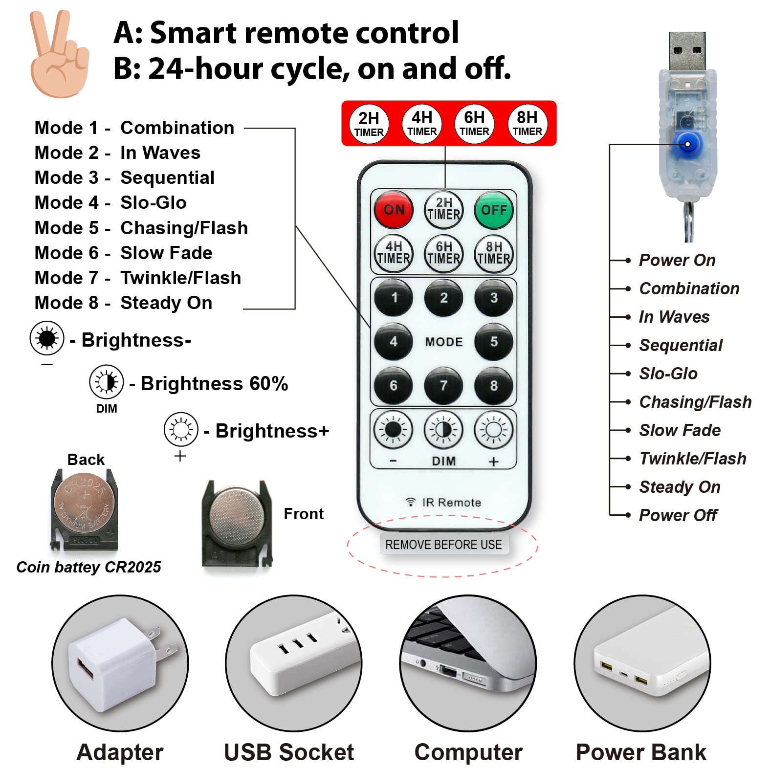- 8 MODE, Time and Levels Dimmable: Controlled Easily with a Wireless remote a distance of 10 to 15 meters, aim at the USB receiving direction when you press; Both you can turn on the timer function and get a 6hrs on and 18 hrs off to choose the time you want and adjust the brightness of the lights by pressing 'dim-' Or Press 'dim+' , that give you more choices for your night