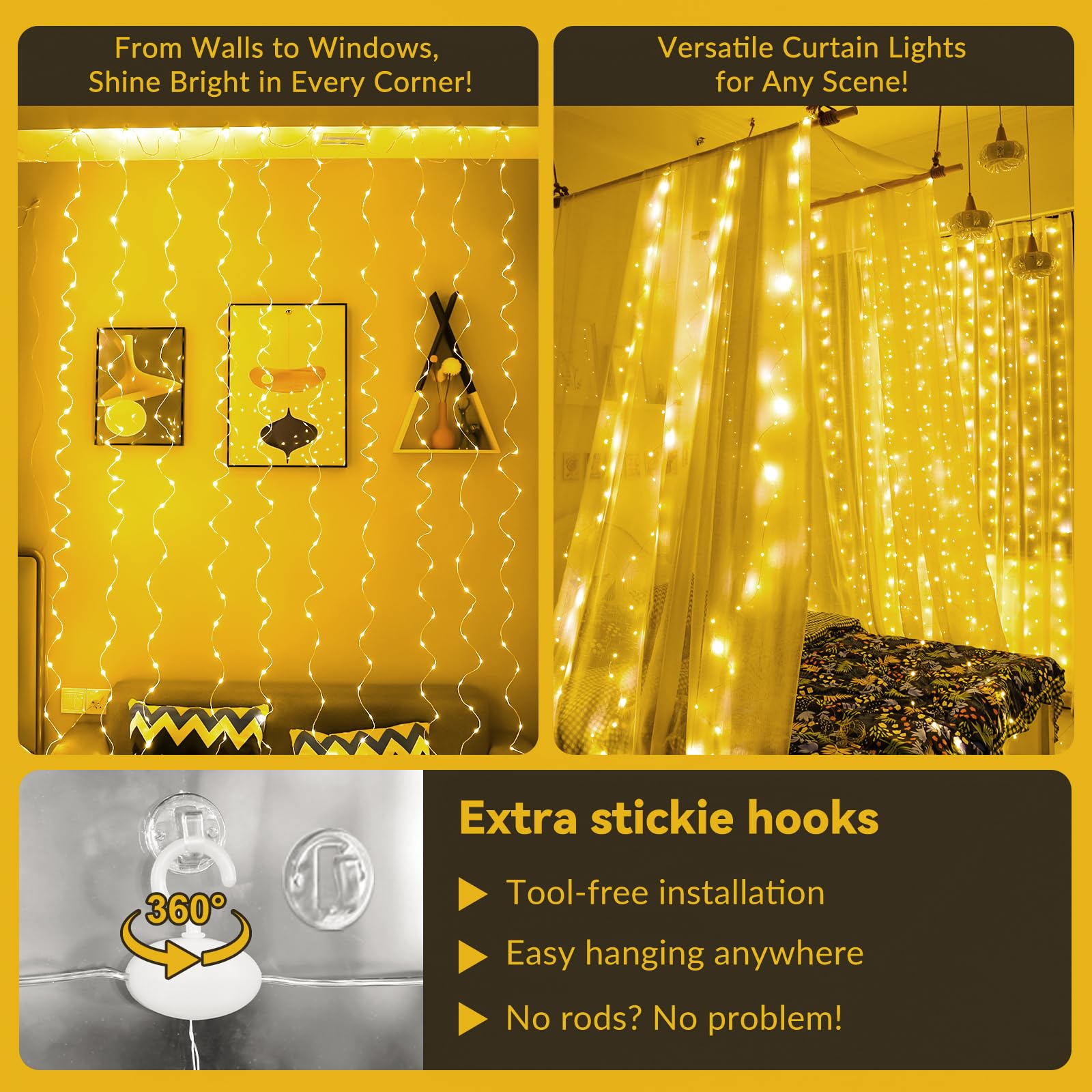 - 360°Rotatable Hooks: Upgrade 360°Rotation Clips on each drop string is mainly used for hooking on curtains; It can be hung at any angle, such as on wall, window or other surface; Also includes 16 sets of Damage-free adhesive hooks; No nails needed and holds strongly and removes cleanly; Both of these two clips make the curtain light easily to be hung for some special places, not only limited to windows, but also can be hung on flat walls, glass, porches, eaves, etc