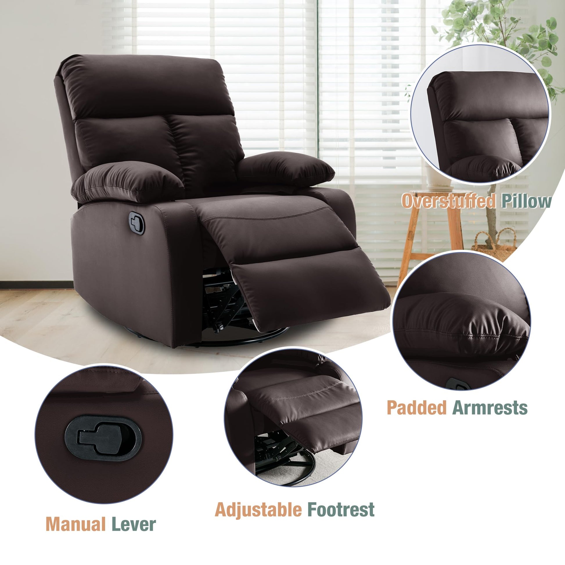 - HZLAGM Swivel Rocker Recliner Chairs: Swivel recliner chairs for adults have 360° Swivel, 30° Rocking, and 90-150° angle reclining function for versatile use. Easily adjust the small rocker recliner chair by pulling out the lever located next to the armrest to activate the footrest. Note that the swivel recliner chair backrest smoothly retracts as you change positions. hzlagm swivel recliner chairs for small spaces brings you a more comfortable life