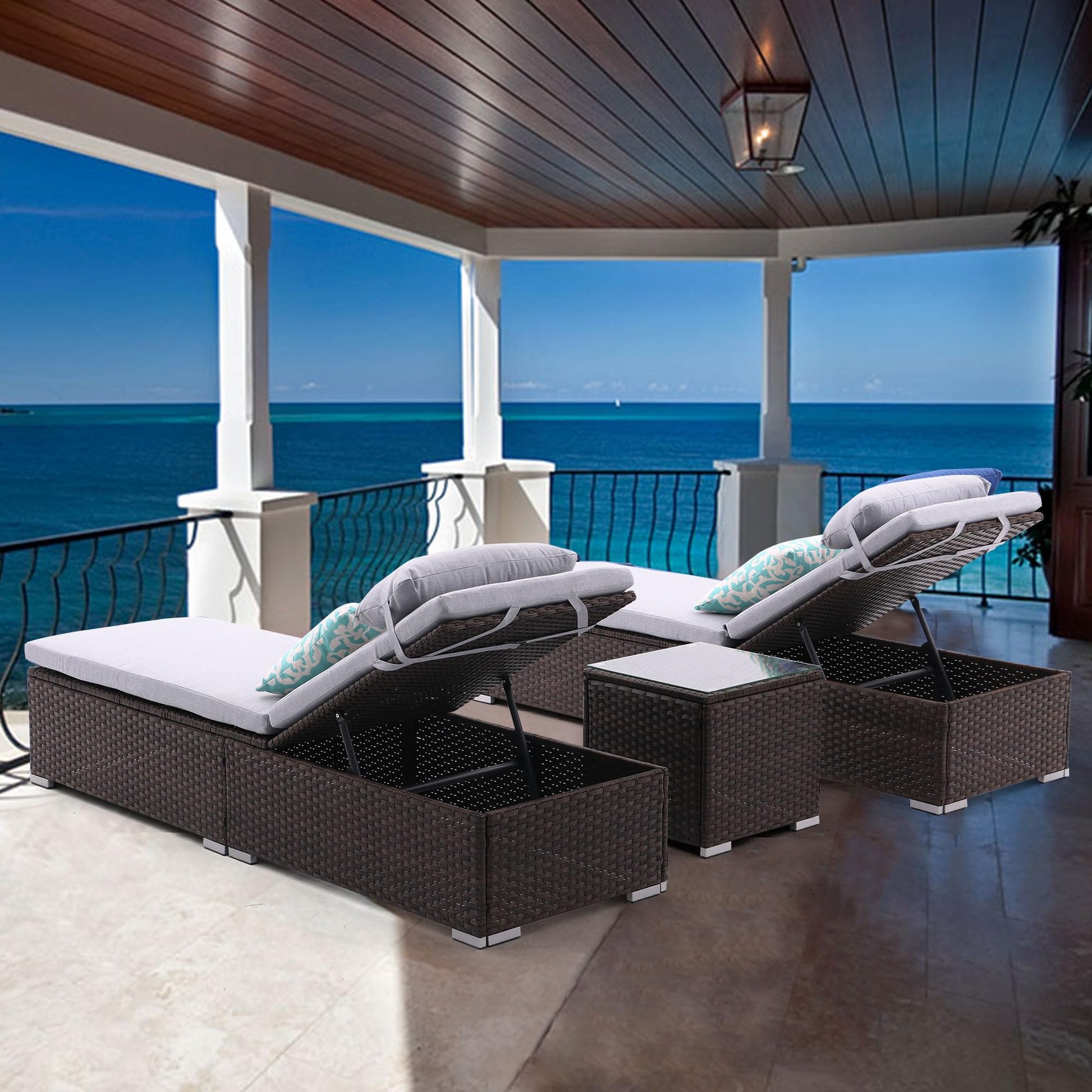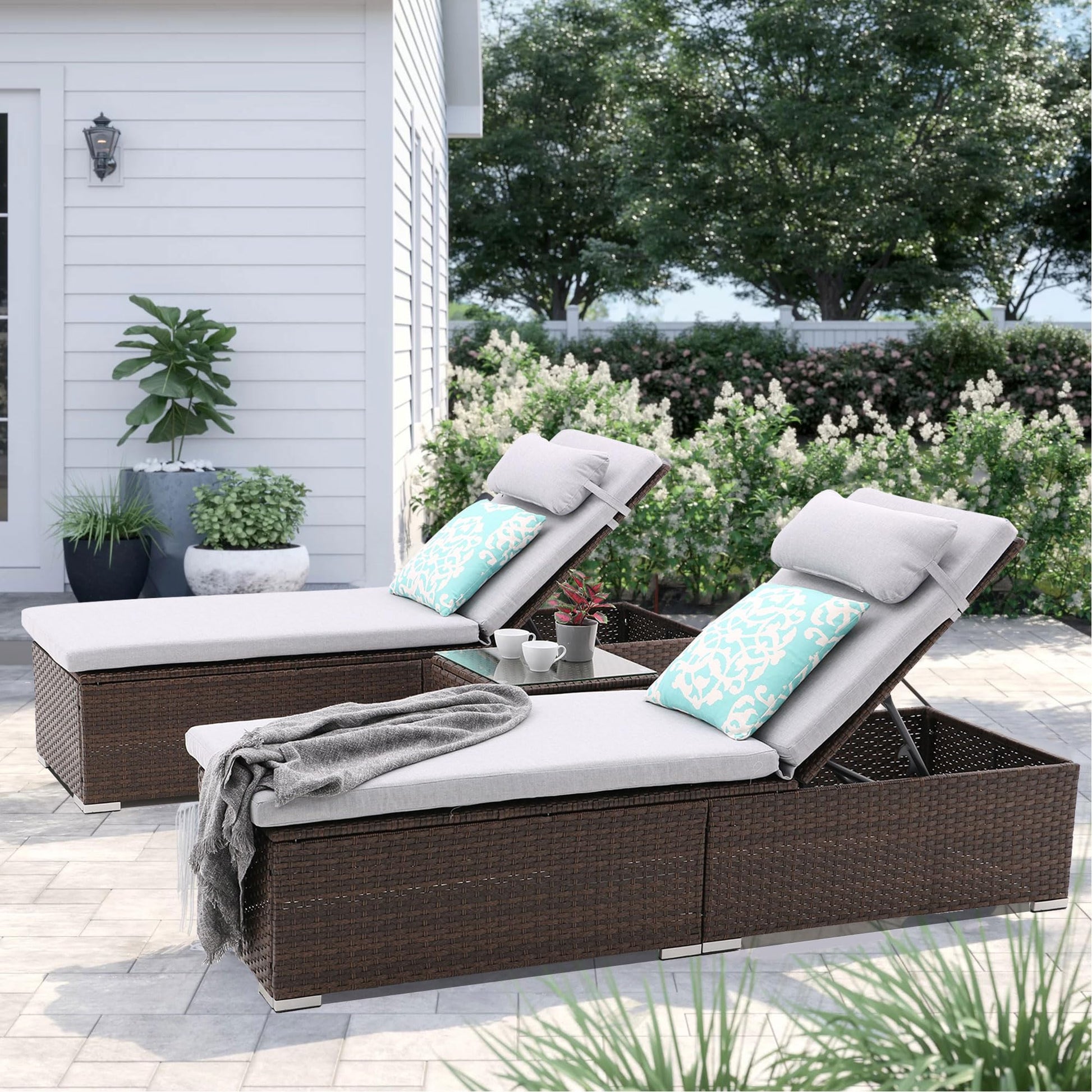 iArtHand 3 Pcs Patio Chaise Lounge with Coffee Table Cushion&Pillow Outdoor Lounge Chair Chaise Lounger Patio Reclining Chair 5 Angle Adjustment Brown Rattan for Courtyards Poolside Garden