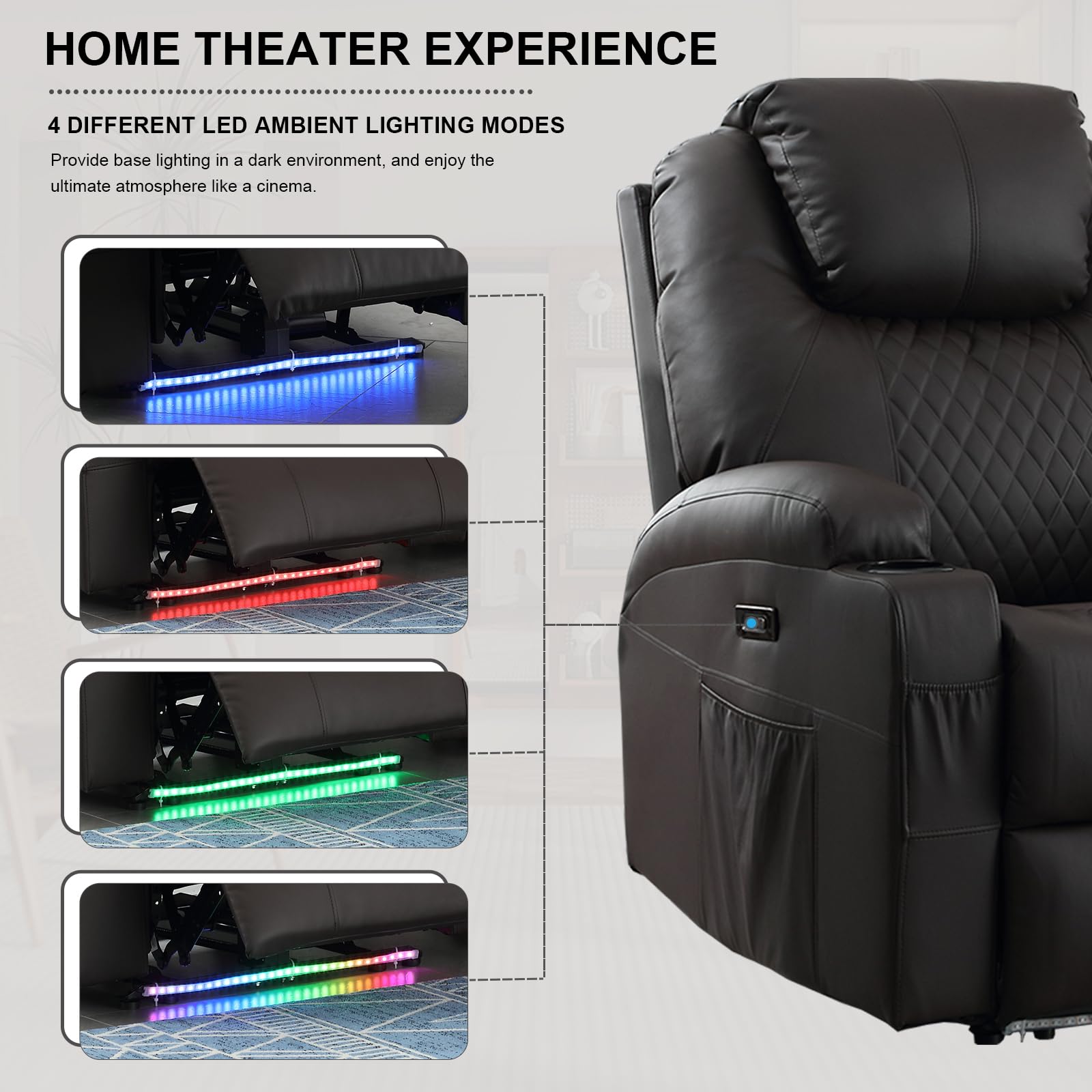 IBTKIG Power Recliner Chair with Heat and Massage, PU Leather Home Theater Seating with LED Lights/Cup Holders/Side Pocket/USB Port, Reclining Sofa Chair for Living Room (1, Brown)