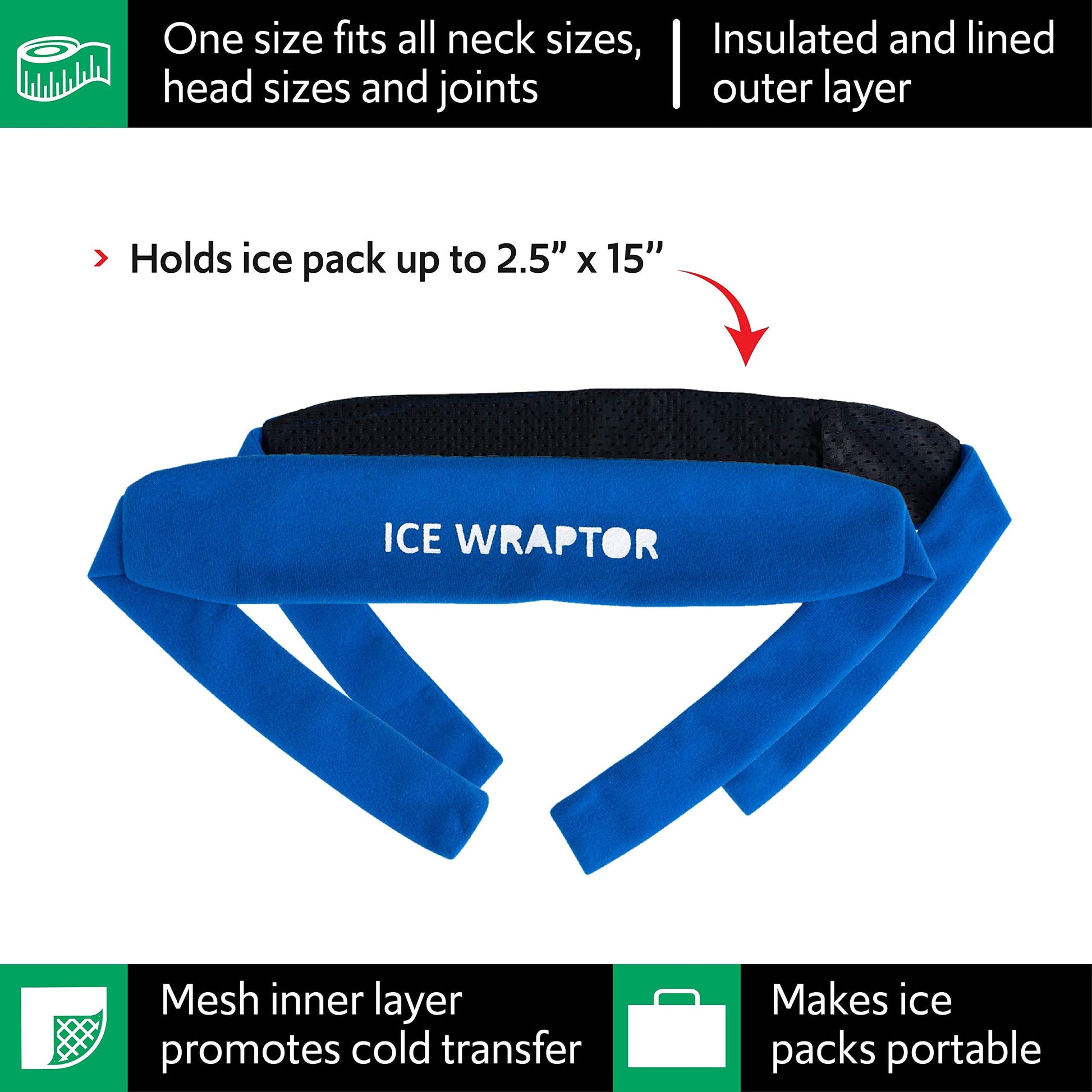 - ❄Get Moving and Get Relief❄: Designed to get you off the couch and moving, the Ice Wraptor Bandana is the chosen wrap by physical therapists for taking your ice packs on the go. Our portable wrap features a mesh back that promotes cold therapy for muscles and joints and a fleece outer layer for insulation and comfort. This bandana can hold an ice pack sized up to 2.5” x 15”.