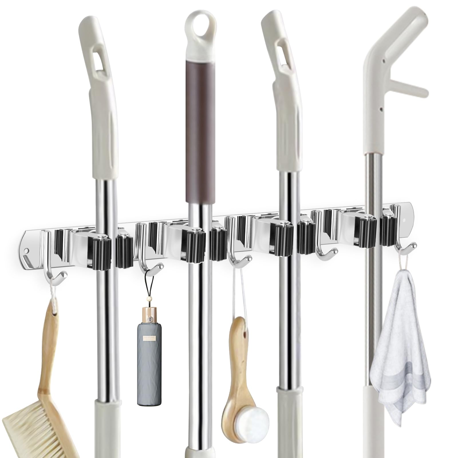 IMILLET 2 Pack Wall Mount Broom Holder Stainless Steel 5 Racks with 4 Hooks Broom Organizer Self Adhesive Heavy Duty Laundry Room, Garage Organization Storage