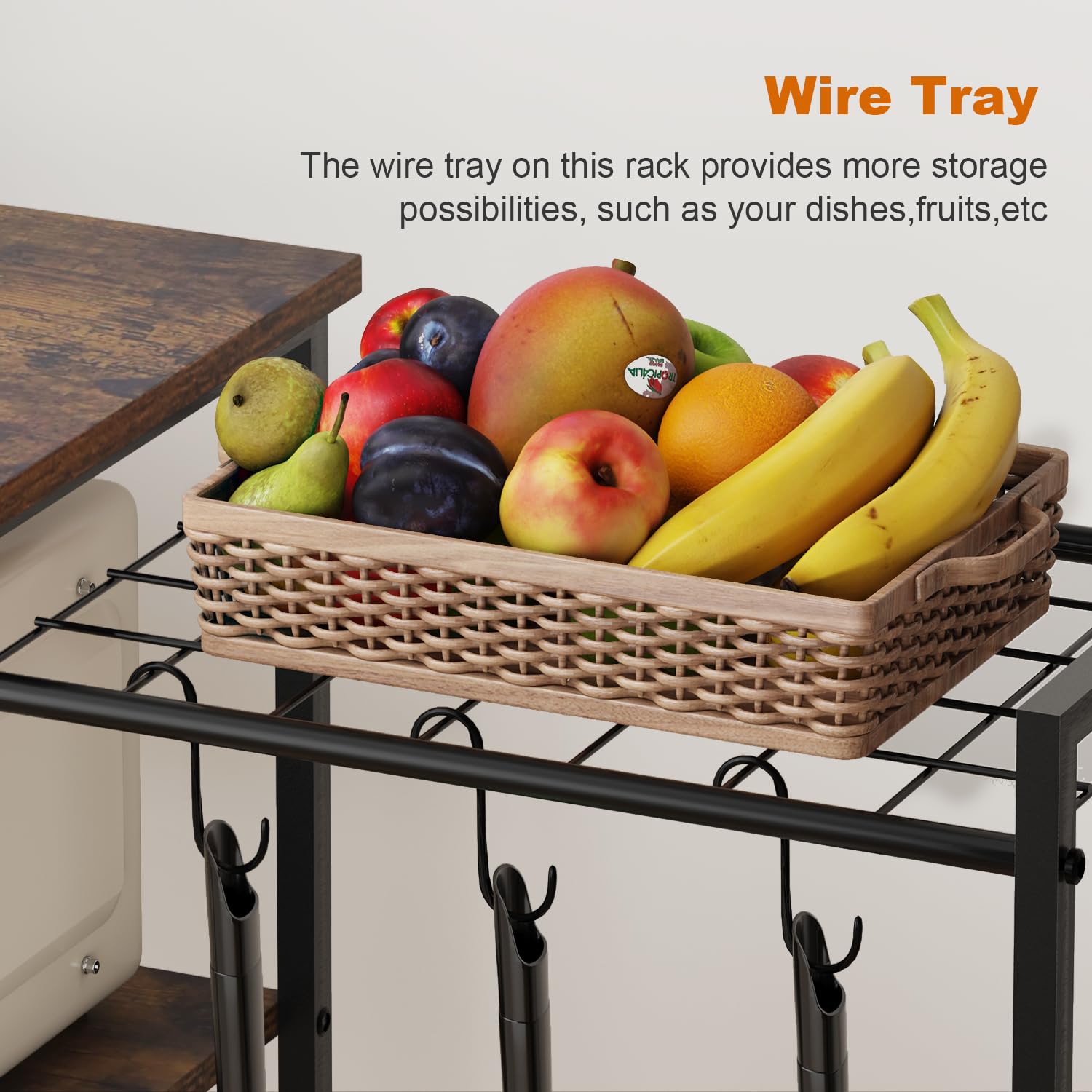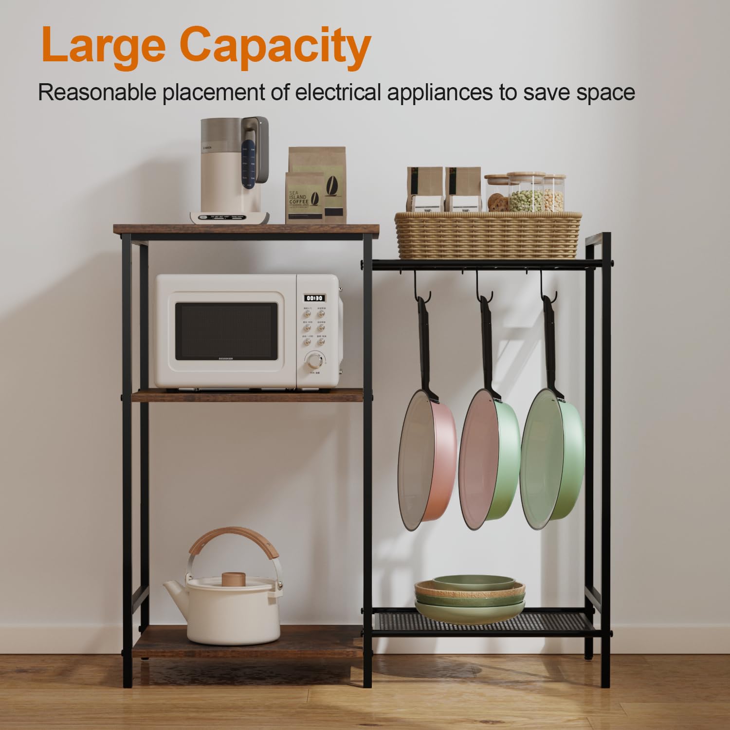 INHABIT UNION Kitchen Stand with Pots Rack Microwave Oven Stand with Storage, Small Bakers Rack Stand with 3 Hooks, Coffee Bar Table with Storage for Spices,Pots,Utensils,Pans,Foods,Rustic Brown