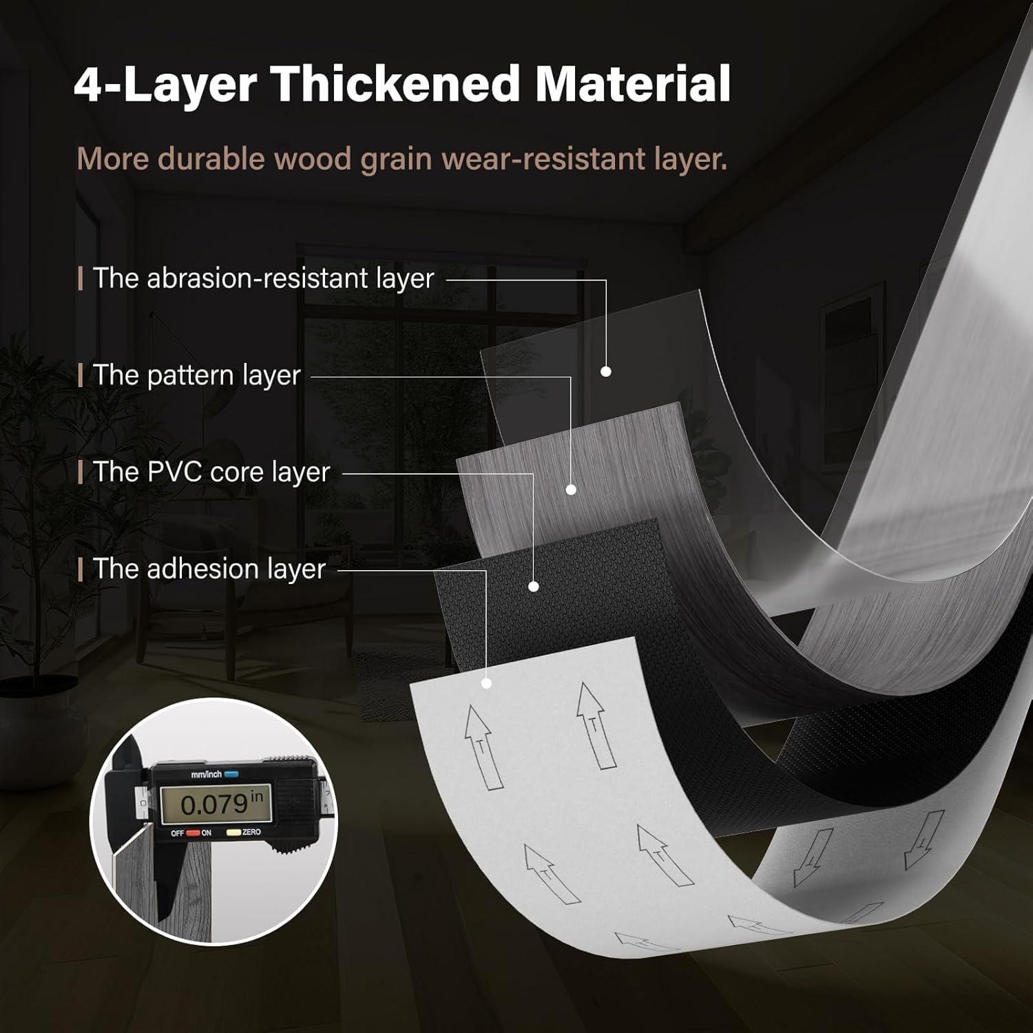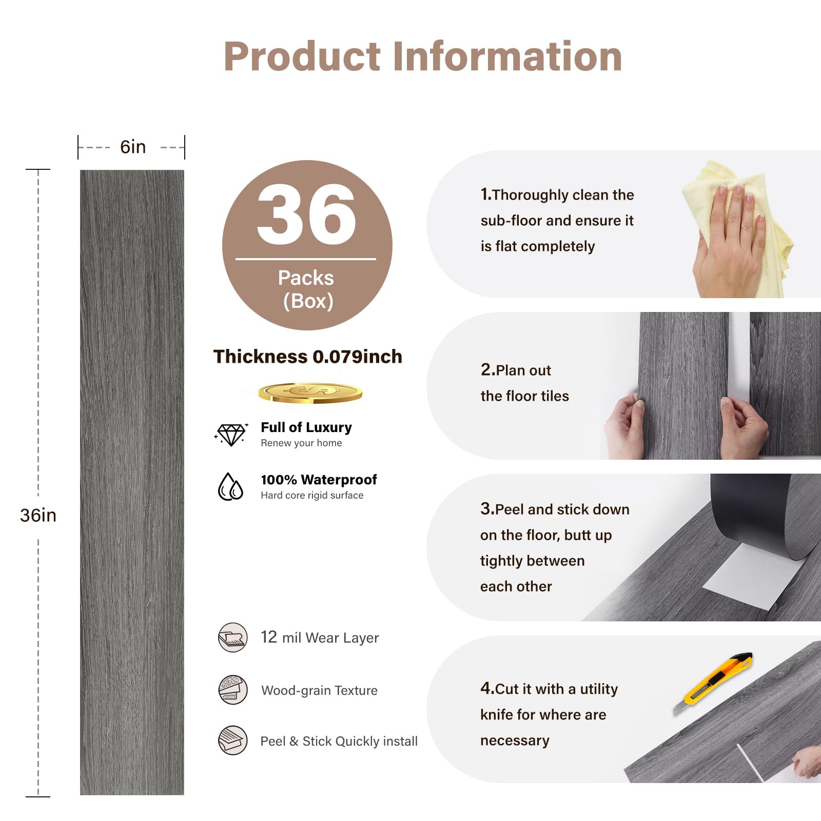 - 🏡Premium Quality Material - Peel and stick vinyl plank flooring Tiles are crafted with the high quality vinyl, ensuring durability and longevity. The package contains 36 pack tiles, each measuring 36x6 inches, providing a total coverage of 54 square feet.