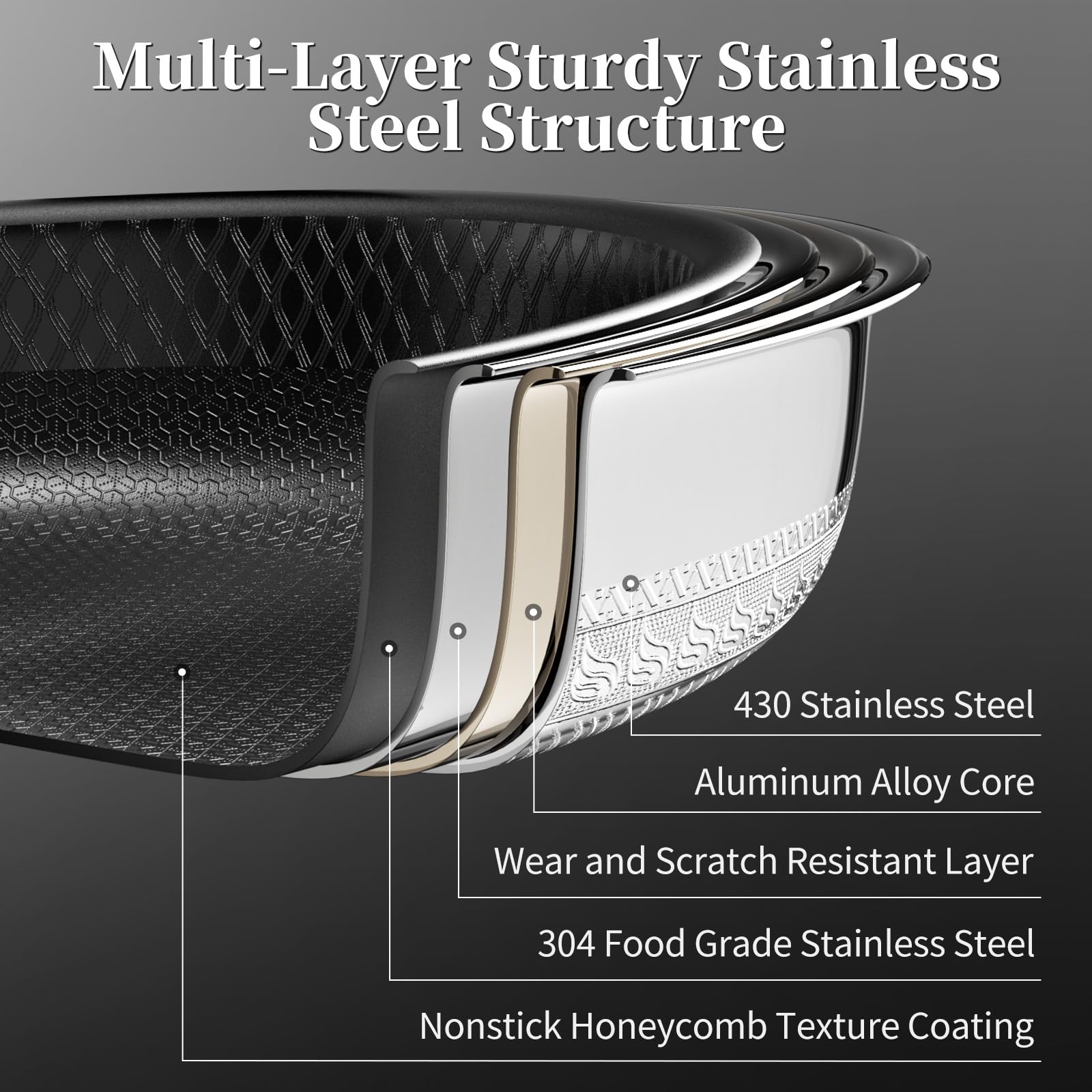 - 【Super Nonstick Dual Honeycomb Texture Design】The titanium ceramics stainless steel frying pan set adopts a dual honeycomb laser-etched process, makes the entire bottom and side walls of stainless steel frying pan are covered with micro-convex grain, reducing the contact area between food and the bottom of the nonstick frying pan, allowing food to suspend on the healthy nonstick coating, improving the nonstick performance of the cooking pan