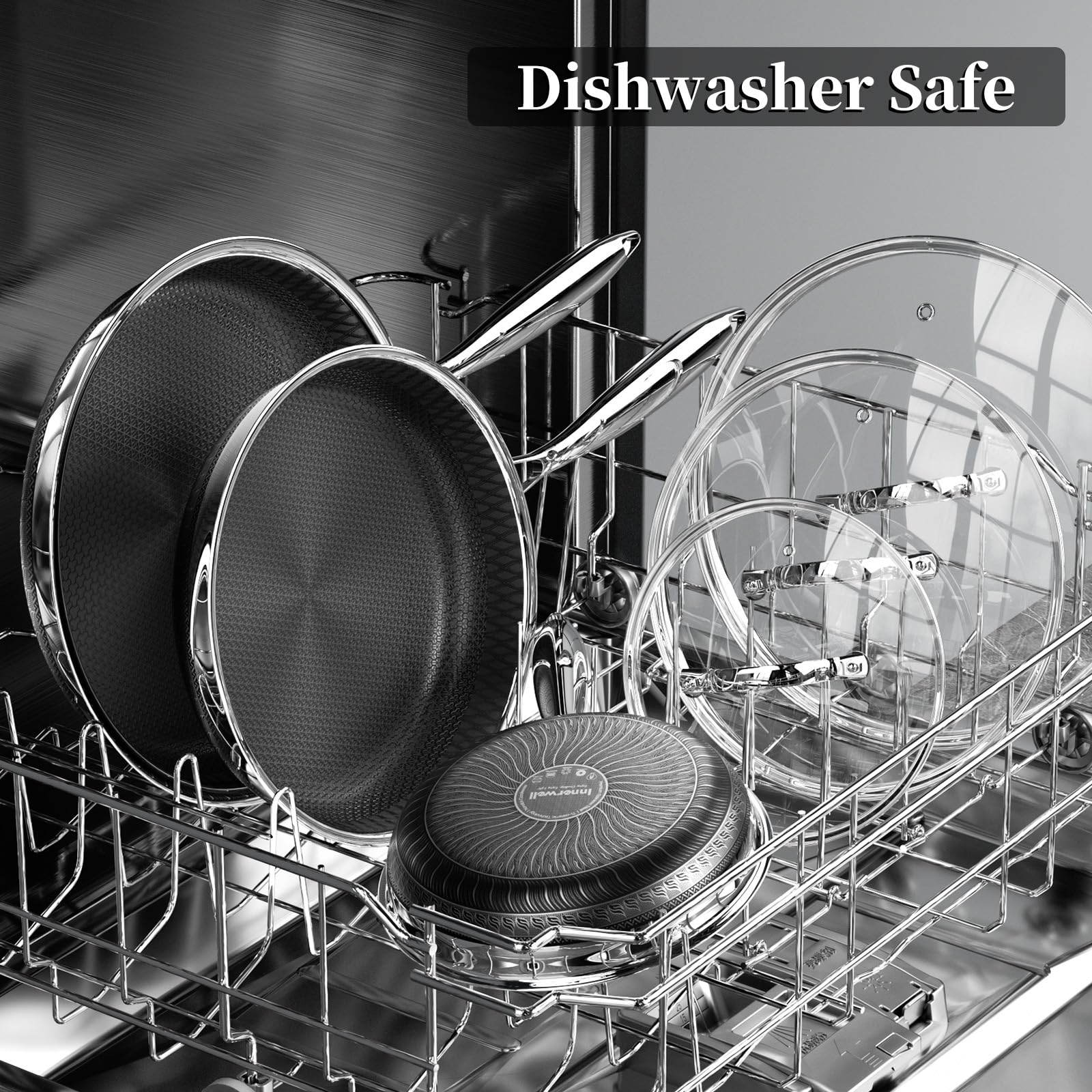 - 【Healthy&Safe Titanium Ceramic Coating】Innerwell stainless steel frying pan with lid adopts titanium ceramic nonstick process. The inner coating combines titanium technology and ceramic non stick technology together, which is acid resistant and corrosion-resistant, and does not react with food. The stainless steel frying pan set with lid has the feature of scratch resistance and wear resistance, no longer need to worry about food contamination due to aluminum metal release. The nonstick frying pan set gets SGS approved, PFOA, PFAS and PTFE free