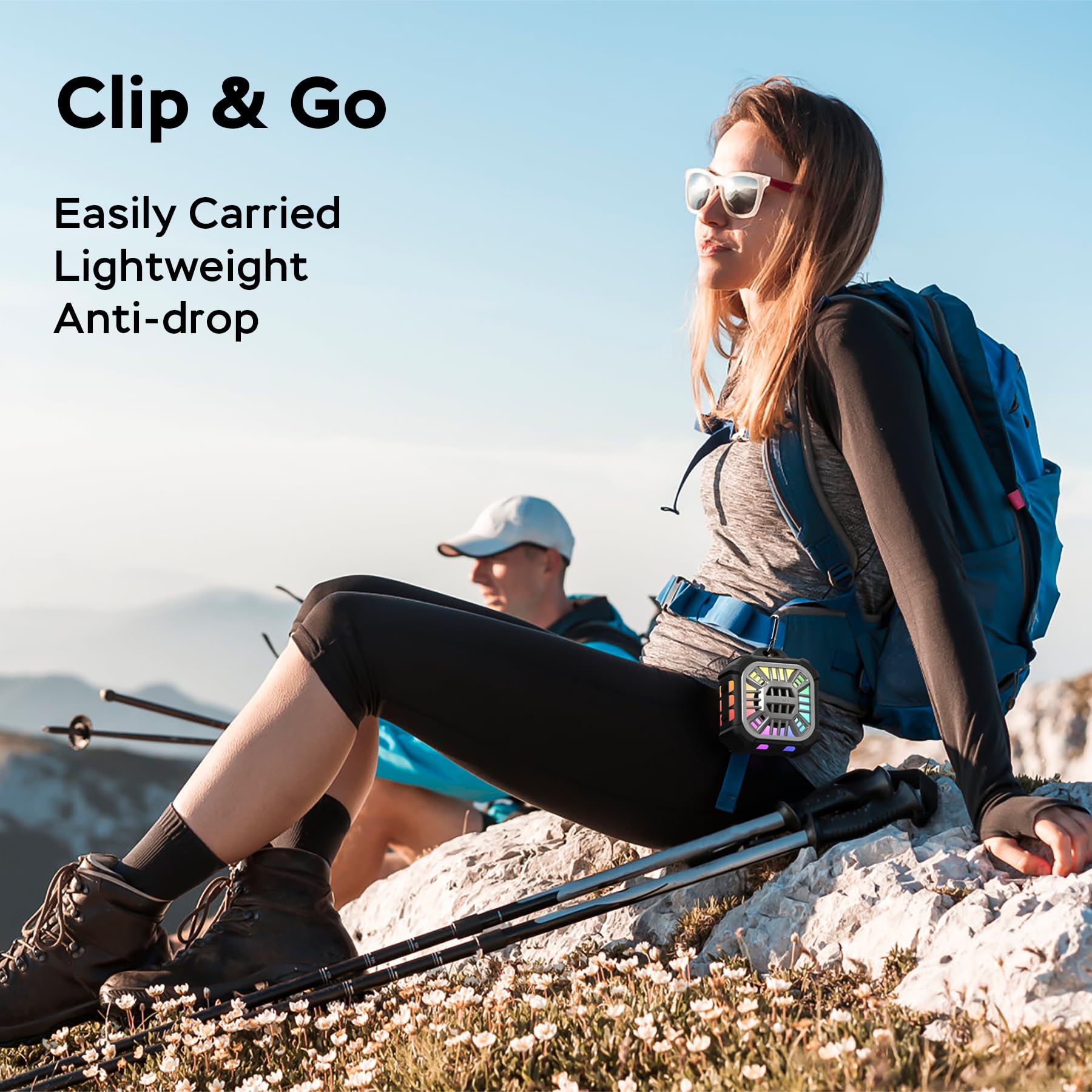 - 【Grab and Go Clip-on Speakers】 The M12 portable size speaker, crafted for ultimate portability, making it your perfect on-the-go companion. Whether you're golfing, at the beach,clip on the bag even hiking running, its compact sleek and lightweight design, complete with a convenient hook, ensures easy carrying perfectly fitting into your backpack.