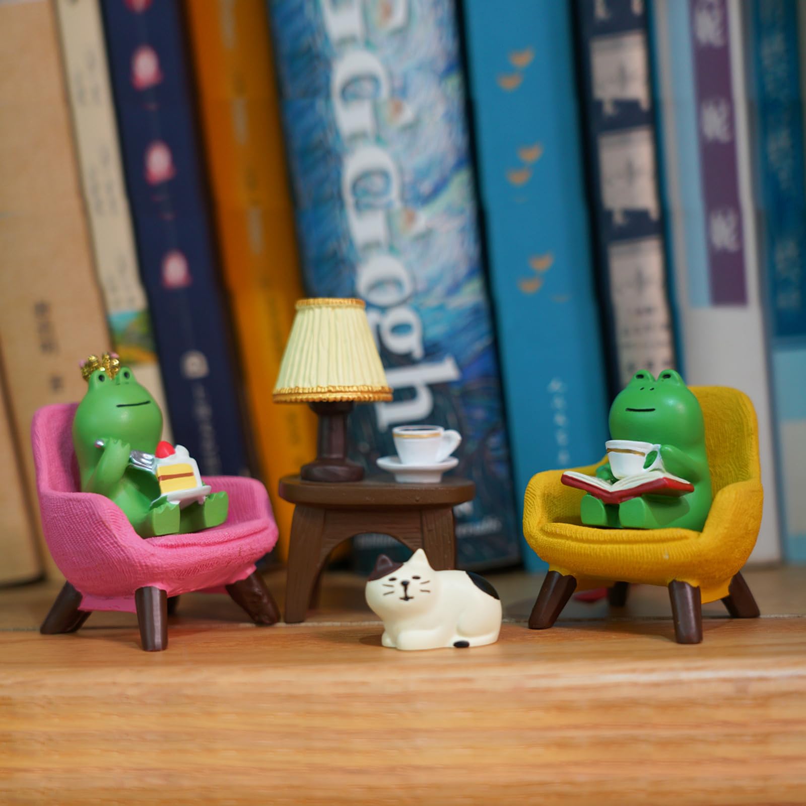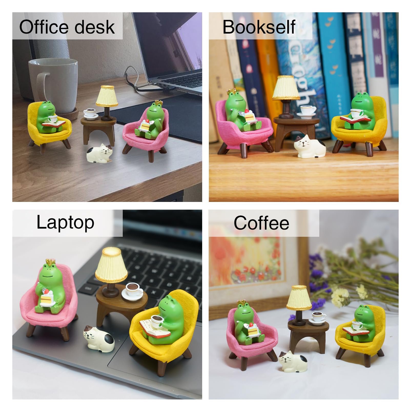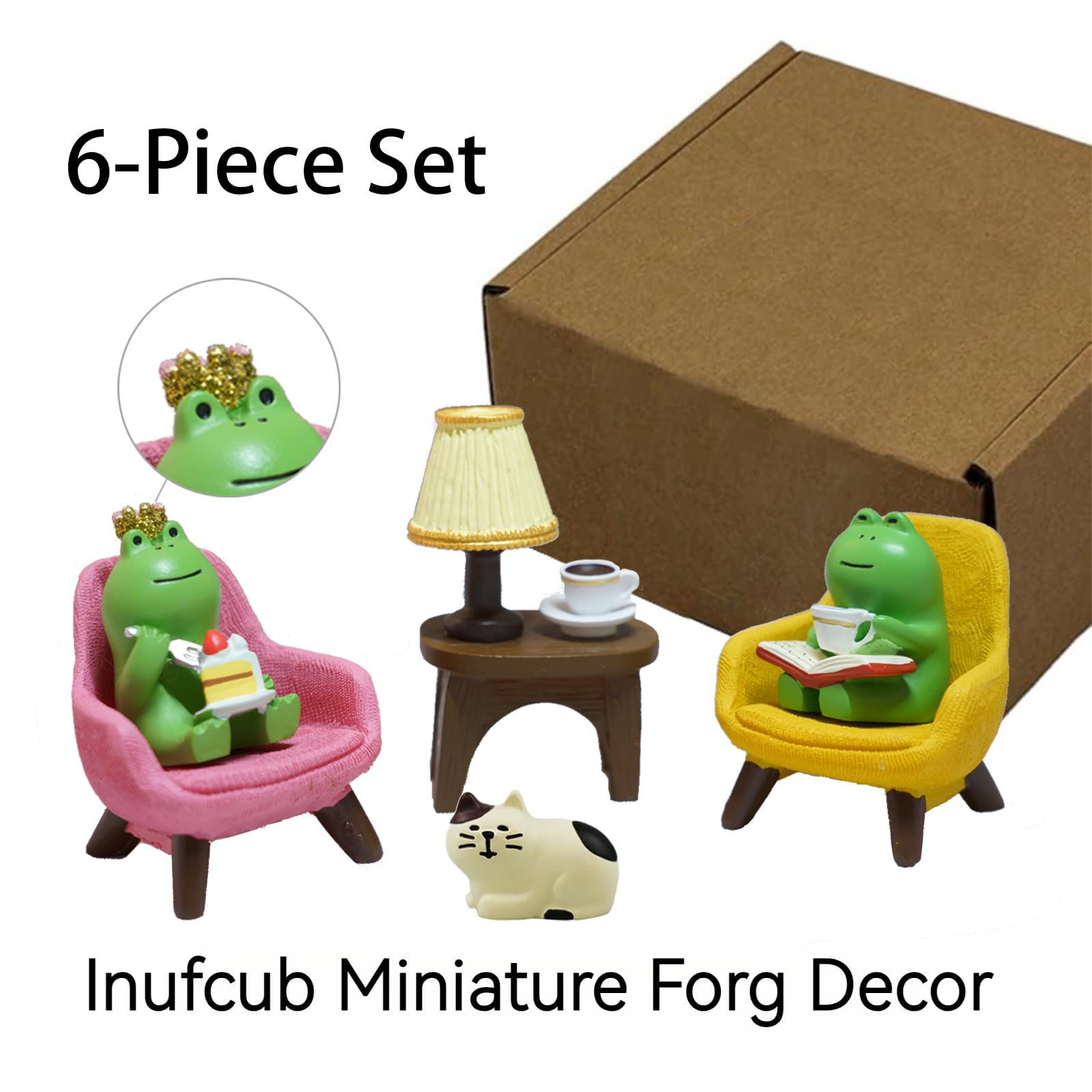 Inufcub Miniature Frog Desk Set with Sofa, Cat & Lamp - 6-Piece Cute Figurines for Office, Fairy Garden & Home Decor, Resin Gift for Frog Lovers