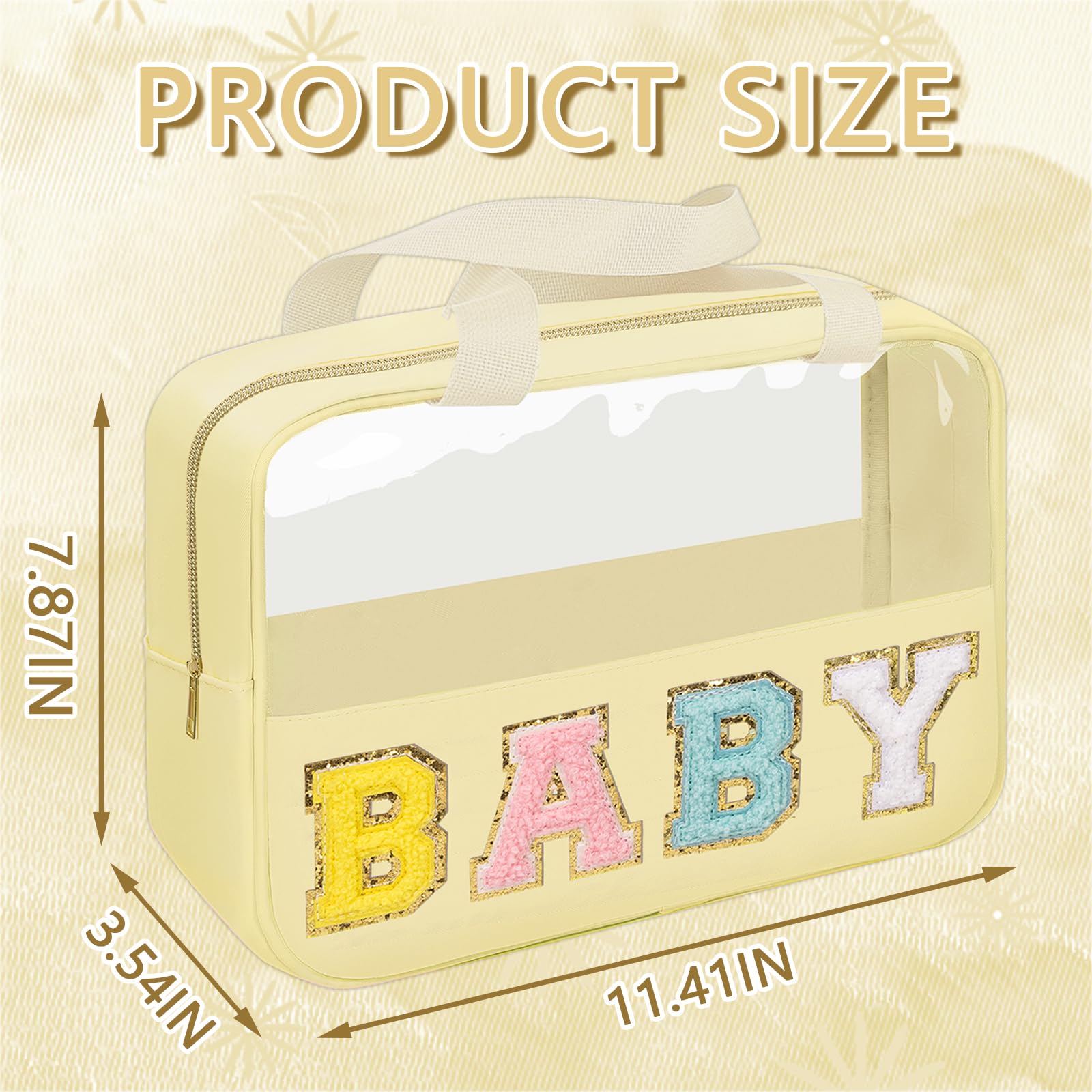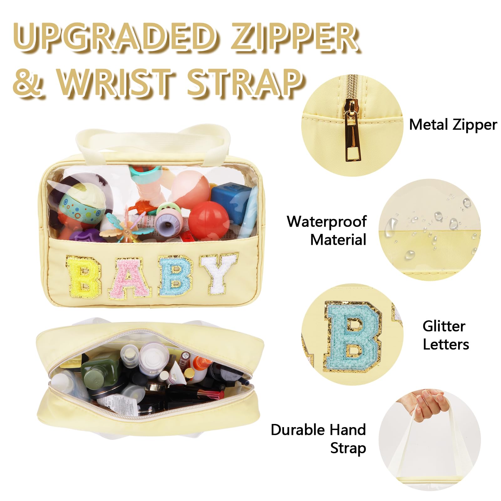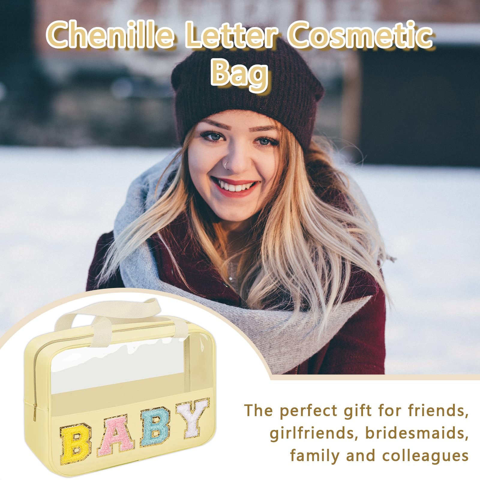 - 【Chenille Glitter Letters】Preppy letter cosmetic bag is 11.41x 7.87 x 3.54 inches. Made of high quality nylon and PVC material, lightweight and durable . Ideal as a clear makeup bag for travel, gym, bathroom, daily carry-on bag and luggage.
