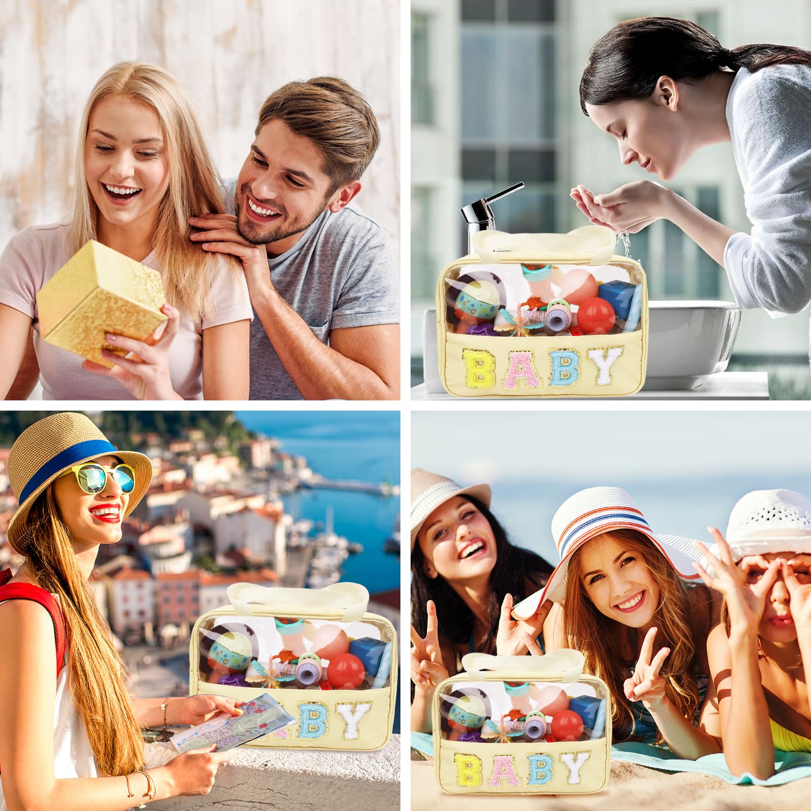 Iqimott Chenille Letter Patch Baby Bag, Preppy Clear Makeup Cosmetic Bag Large Toiletry Storage Tote Bag with Handle, Transparent Nylon Waterproof Organizer Zipper Pouch for Travel Women Girls(Beige)