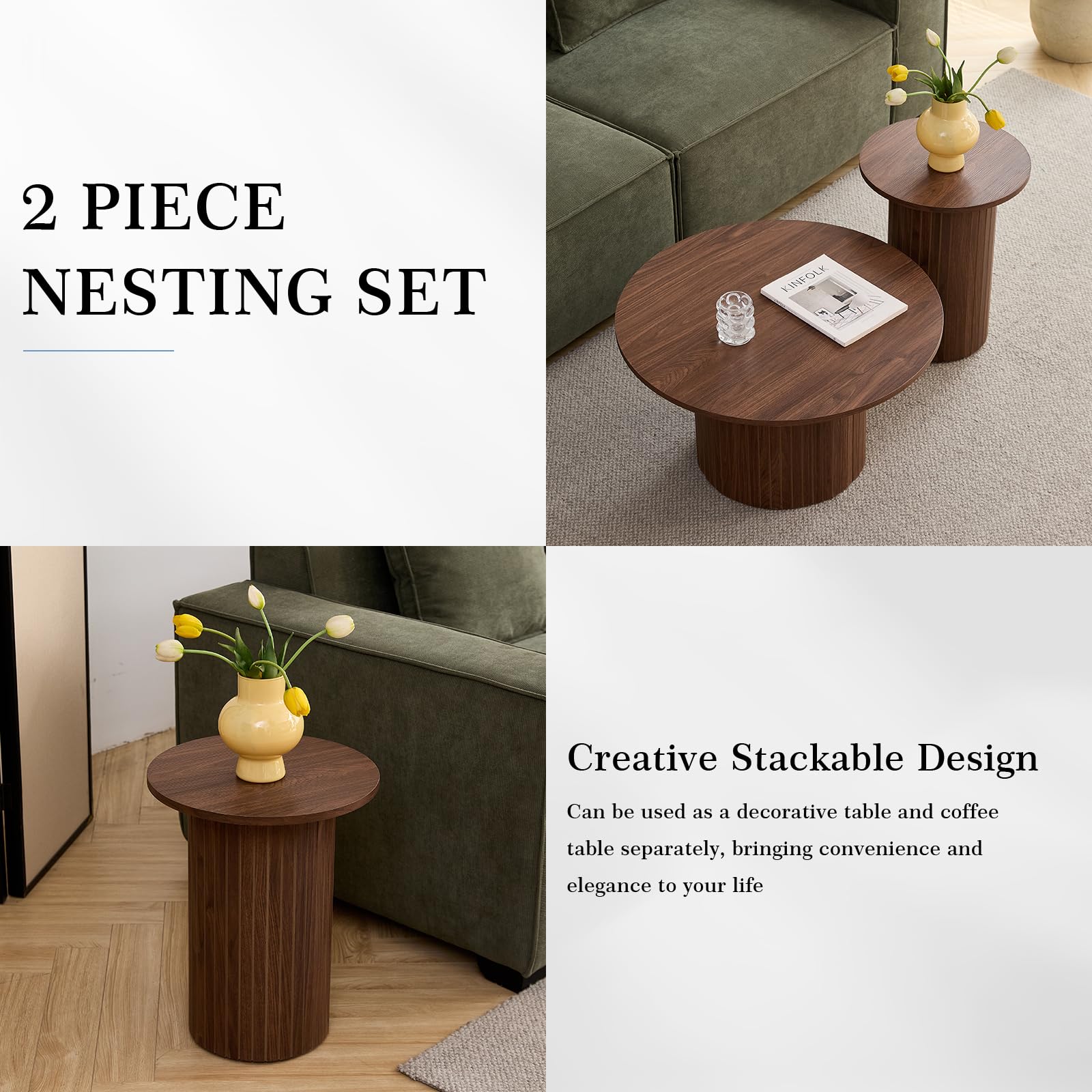 • [Versatile for Multiple Scenes] Our two - piece coffee table set consists of one large round coffee table and one small round coffee table. They can be used either separately or combined. In the living room, they can serve as chic coffee tables; in the bedroom, they can be convenient bedside tables and corner tables; and they can even be stylish side tables to decorate a peaceful courtyard.