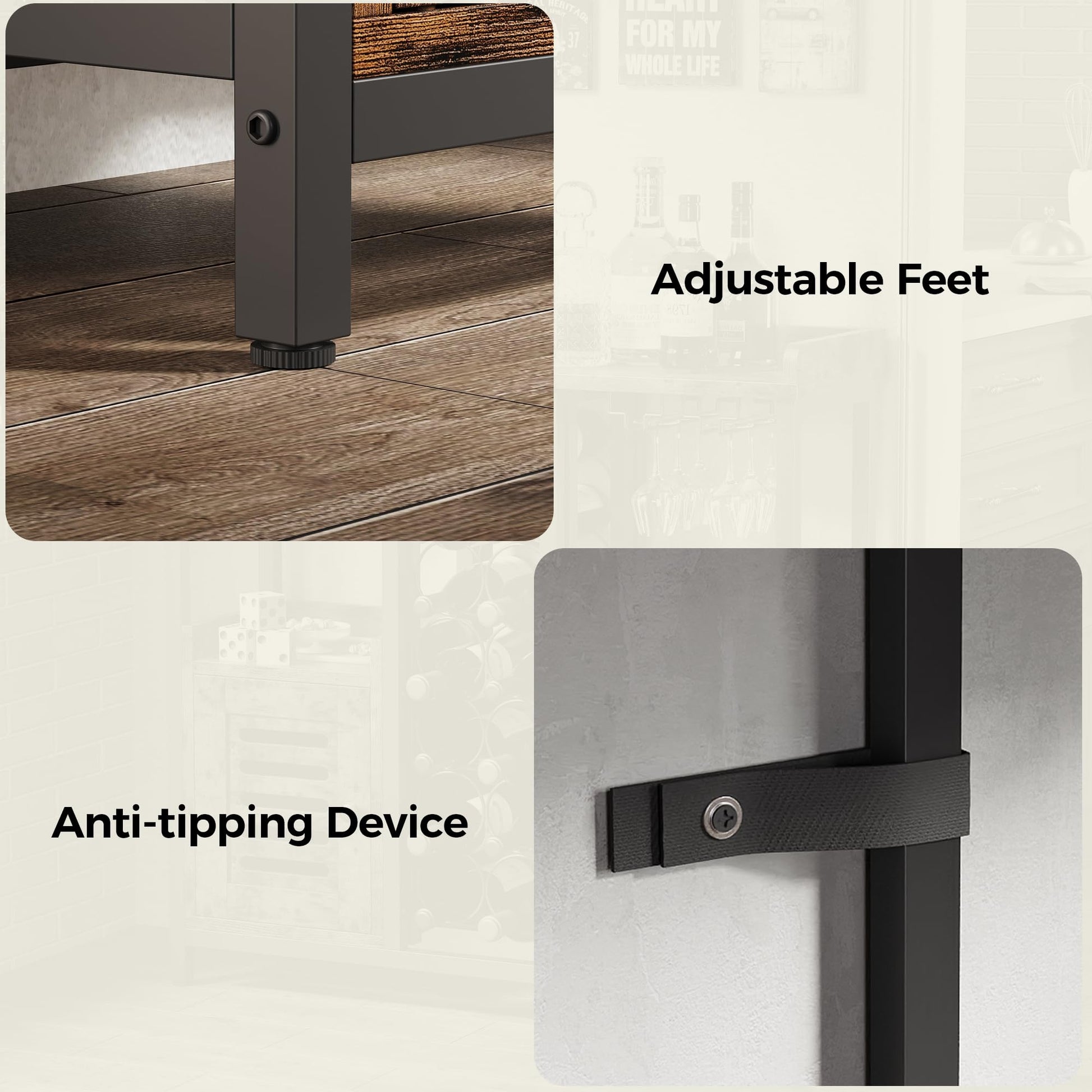 - Durable and Secure Construction: Crafted from high-quality particleboard with a sturdy iron frame, this wine cabinet is designed to securely bear the weight. Its adjustable feet enhance stability, effectively preventing items from toppling.