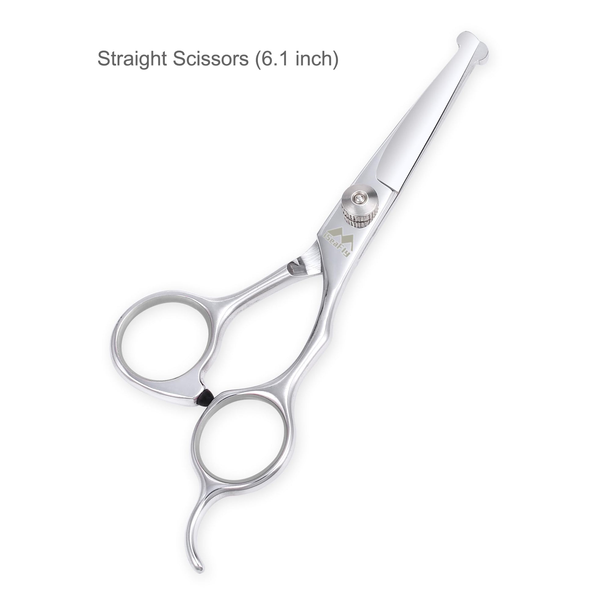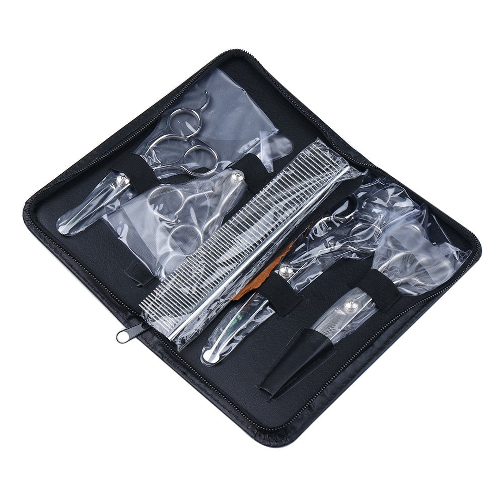 - 【Perfect Pet Grooming Kit】: This cat & dog hair scissors kit includes 1 × 7.3'' thinning shears, 1 × 7.3'' curved scissors, 1 × 6.1'' straight scissors, 1 × 5.3'' straight scissors, 1 × pet comb, 1 × cleaning cloth, and 1 × stylish black leather case. With this dog grooming kit you can trim any part of your pet such as body, face, nose, ear, tail, paw etc.