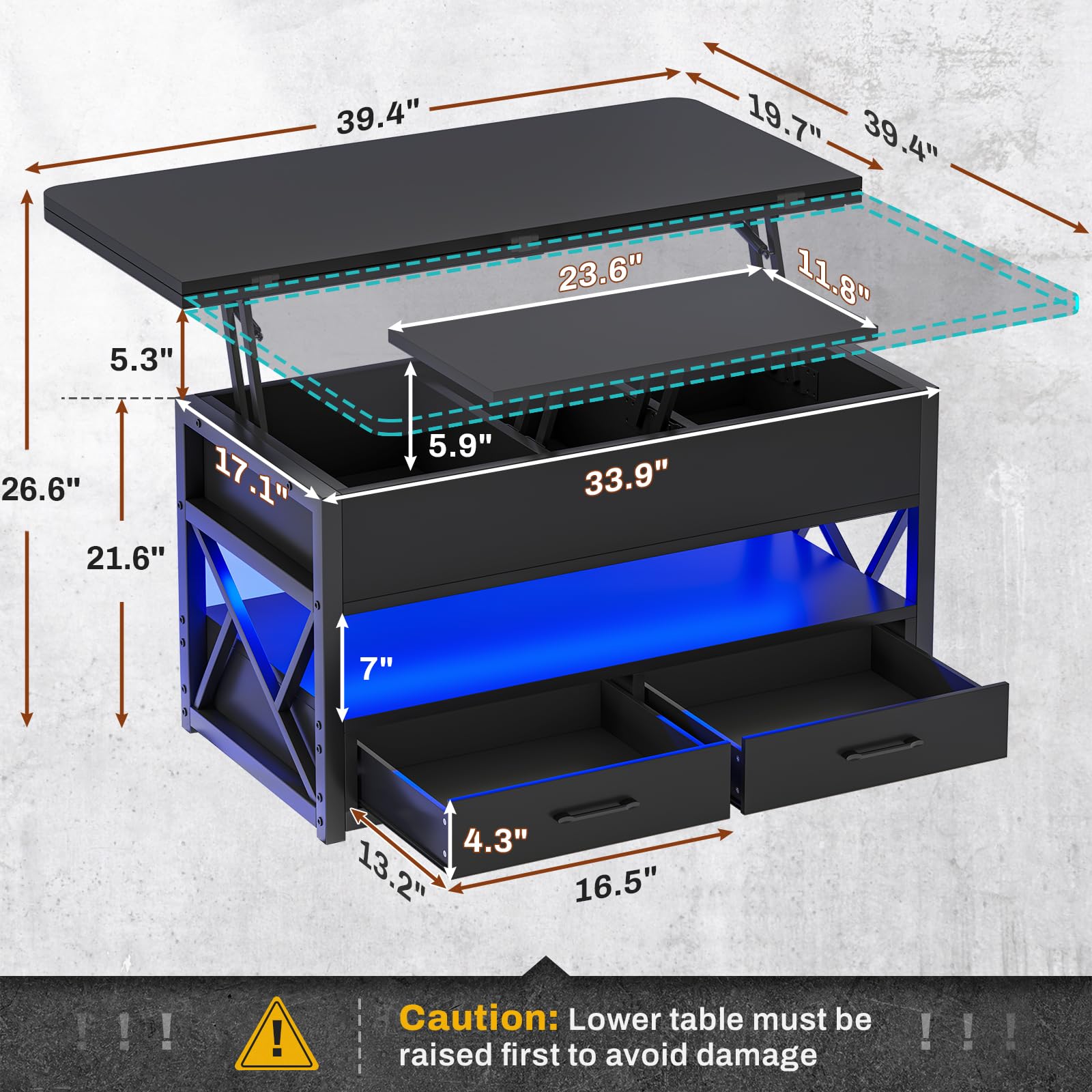 - 【What you get?】The lift top coffee table with 4 lifting methods also has partitioned hidden storage compartment, an open storage shelf, 2 drawers and LED light. A small coffee table for living room can be used when eating, working, studying and playing games, quietly and easily lift the table top to facilitate small room to make full use of the space.(Caution: Lower table top must be raised first to avoid damage. )