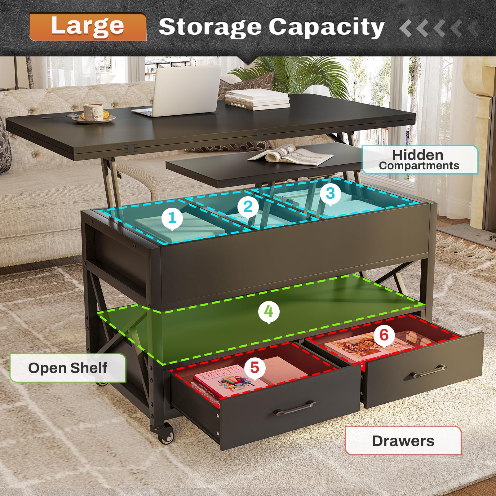 - 【4-in-1 Lift Design】Unique lift top coffee table design to meet more needs--when fully unfolded, it becomes a dining or gaming coffee table for 8 people; when half expanded, it becomes a workstation for 2 people to use at the same time without disturbing each other; when lifting top is closed, farmhouse coffee table is suitable for storing sundries.