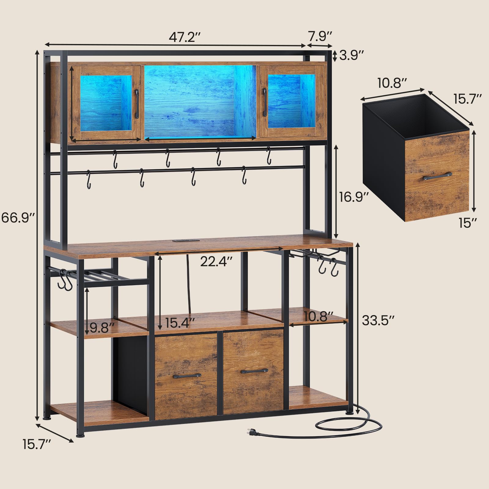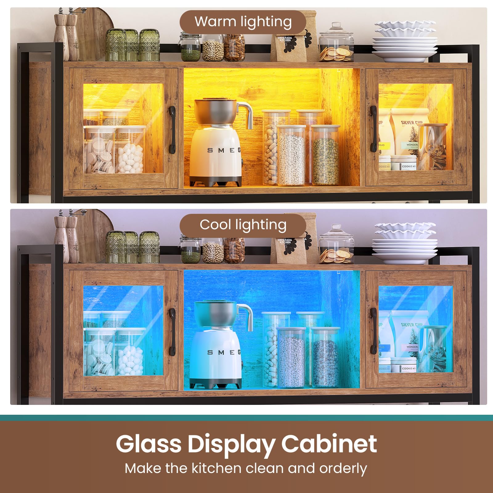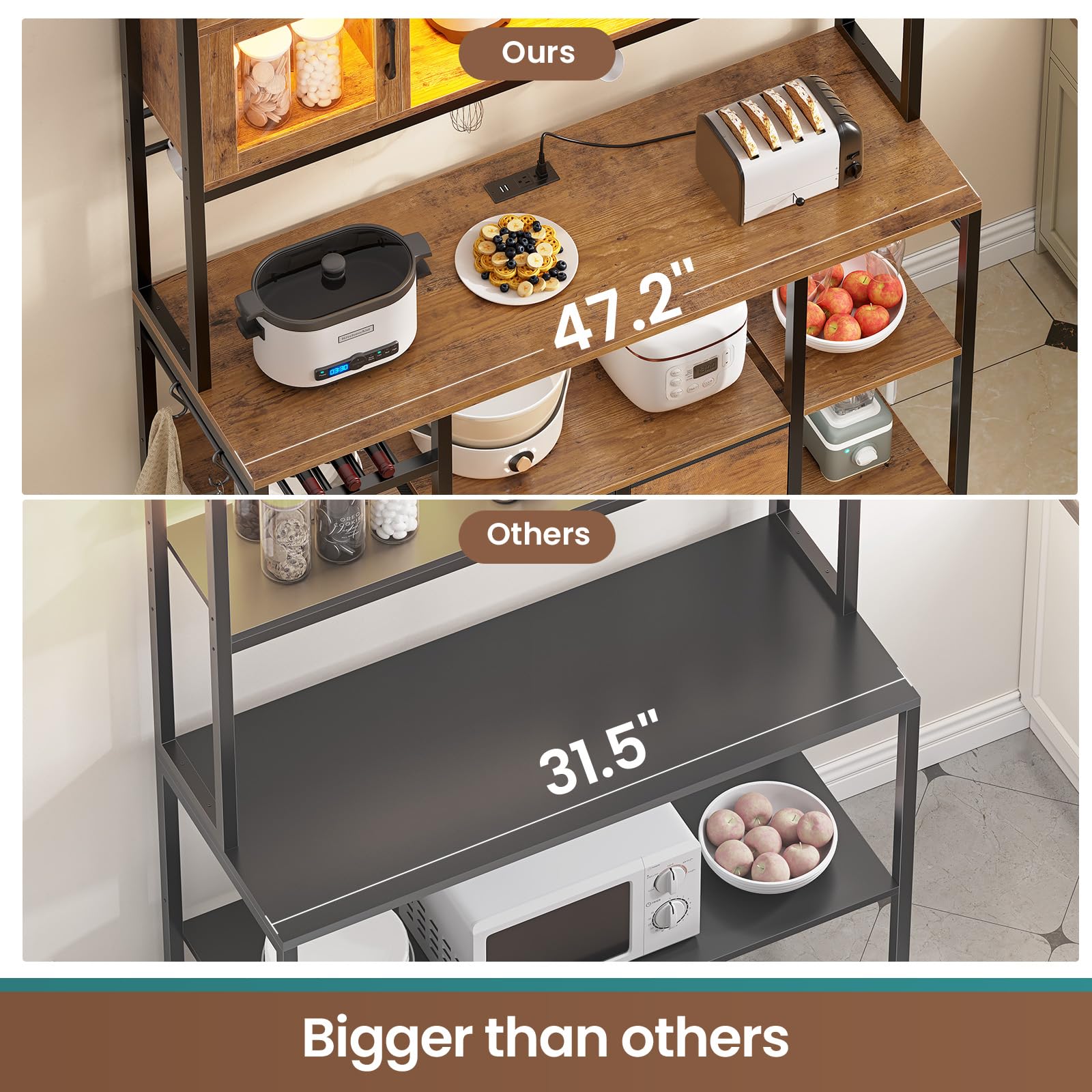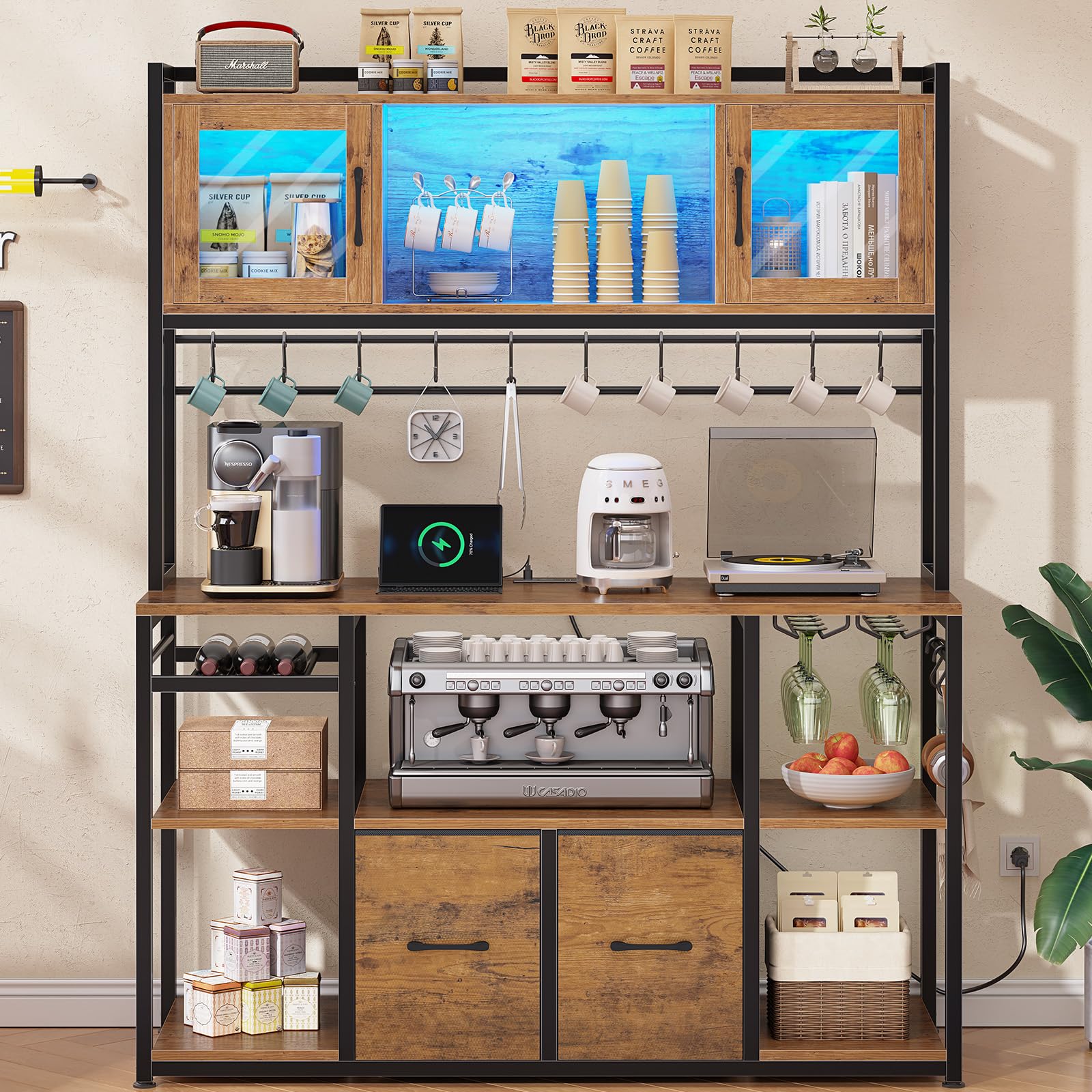Itaar 47.2 Inch Coffee Bar Cabinet with Power Outlet, Farmhouse Bakers Rack with Storage, Kitchen Microwave Stand with Wine Rack, LED Light, Glass Cabinet, Goblet Holder and 12 Hooks (Rustic Brown)