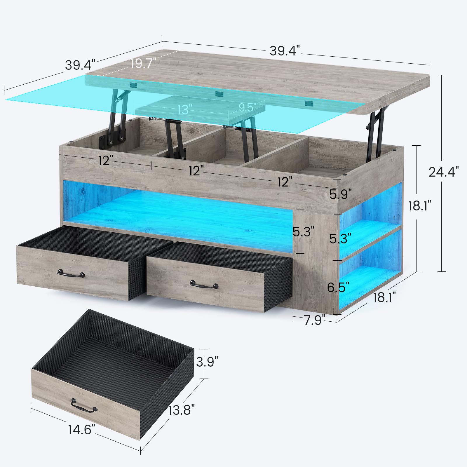 Itaar Lift Top Coffee Table, 4 in 1 Coffee Tables with Storage and Hidden Compartment, Farmhouse Coffee Table with 2 Fabric Drawers & LED Light for Living Room, Grey Oak