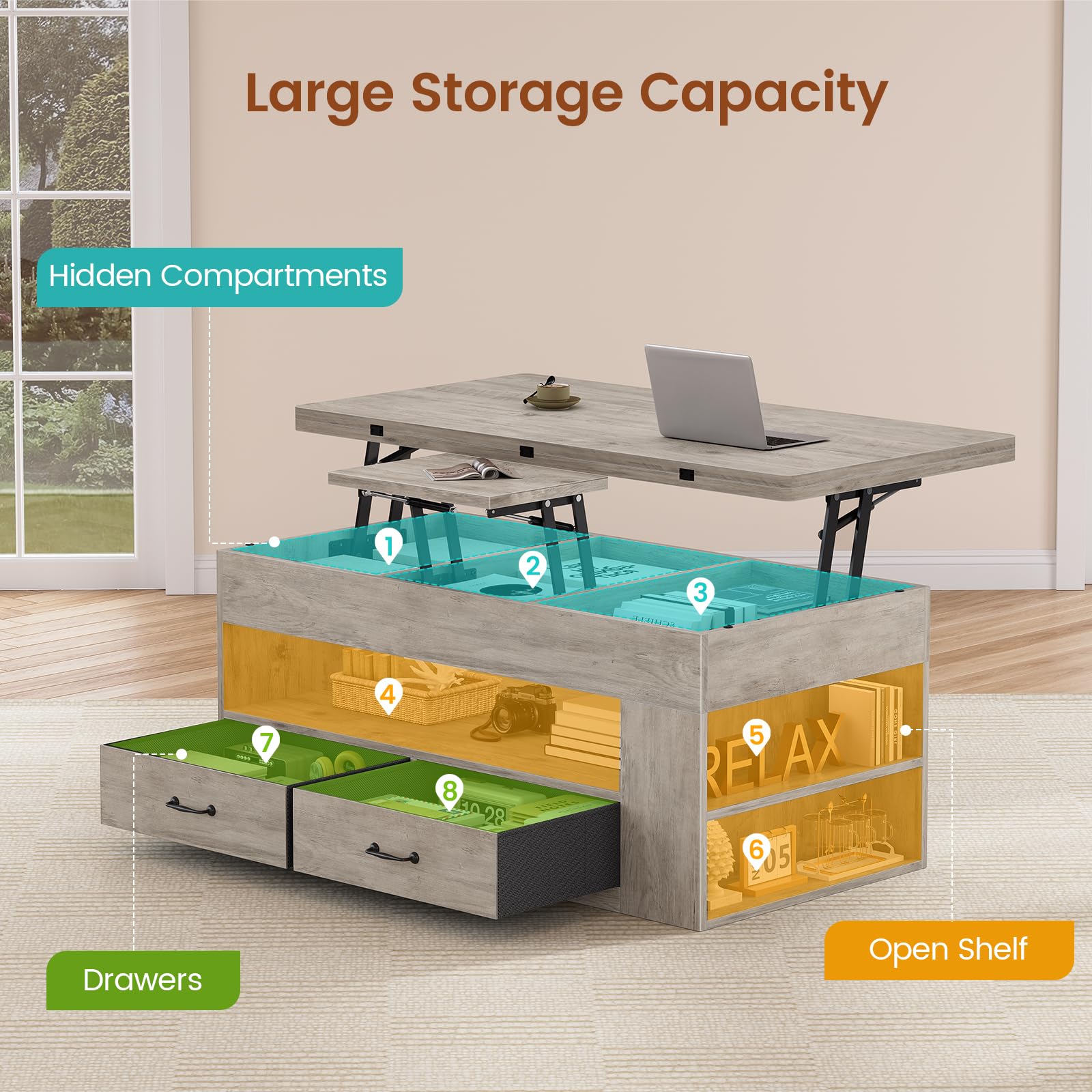 - 【Extra-Storage Space】This Lift top coffee table comes with hidden storage compartments with 3 dedicated sections for blankets, snacks, and electronics, plus an open lower shelf and 2 fabric drawers for laptops, chess sets, or decor. The side tiered shelves conveniently hold cups, candles, and game consoles—keeping everything organized yet accessible.
