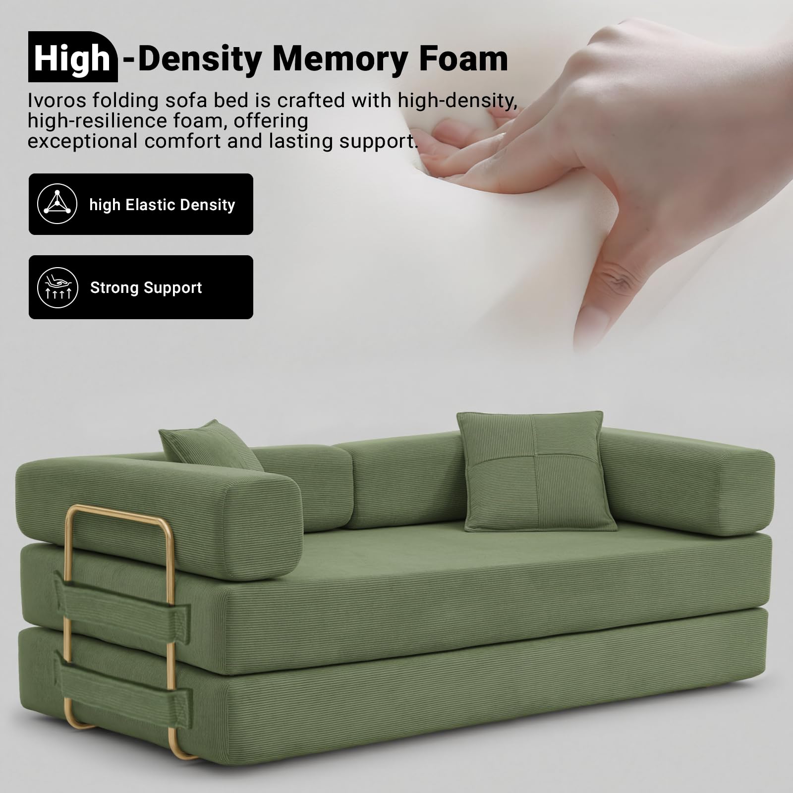 ivoros Folding Sofa Bed, Convertible Sleeper Sofa Bed with Gold Fixed-Shape Frame, Corduroy Floor Couch, Lazy Compression Sofa for Living Room, Bedroom, Home Theater, Green
