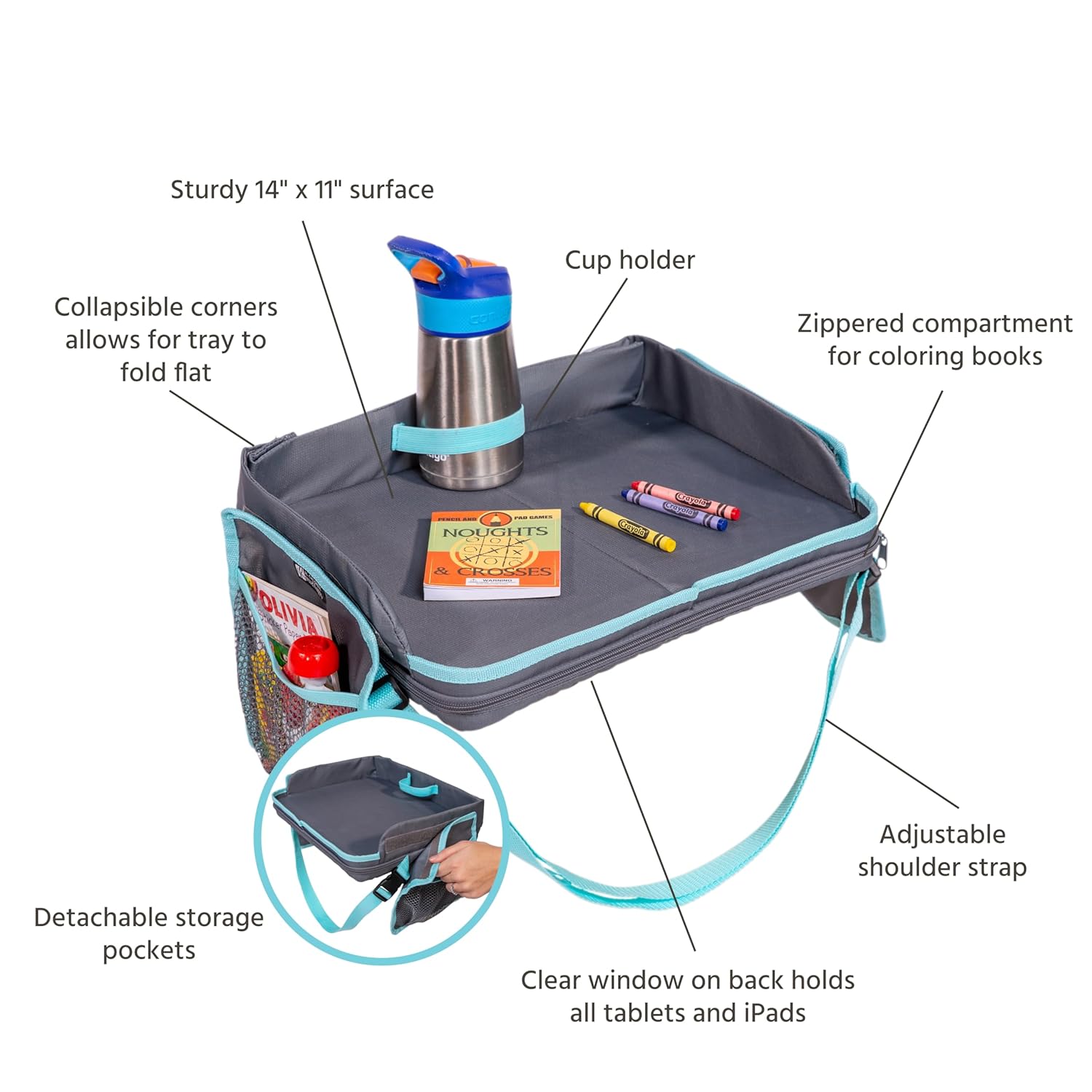 J.L. Childress 3-in-1 Travel Tray & iPad Tablet Holder - Car Seat Lap Tray for Toddlers, Kids - Use on Airplanes, Road Trips, Lap Desk - Tablet Holder and Carry Bag - Grey/Teal