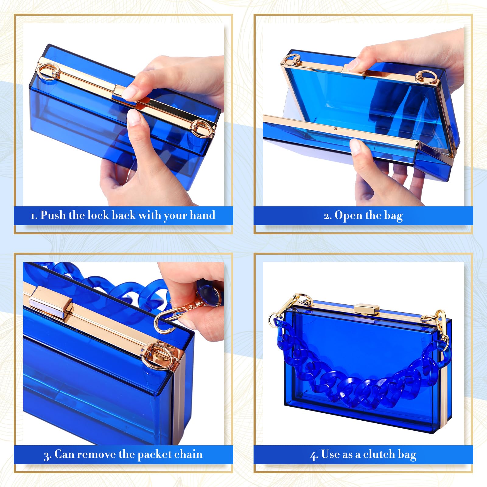 - Appropriate Size: the acrylic bag measures about 7 x 4.3 x 2 inches/ 18 x 11 x 5 cm, large enough for you to store mobile phones, lipstick, perfume, keys, and other small items; The bag comes with 2 different chains for you to choose from, the short one is about 15.75 inch/ 40 cm, and the long one is about 45.28 inch/ 115 cm; The size of the bracelet is about 6.3-8.27 inch/ 16-21 cm, and you can adjust it according to your wrist size