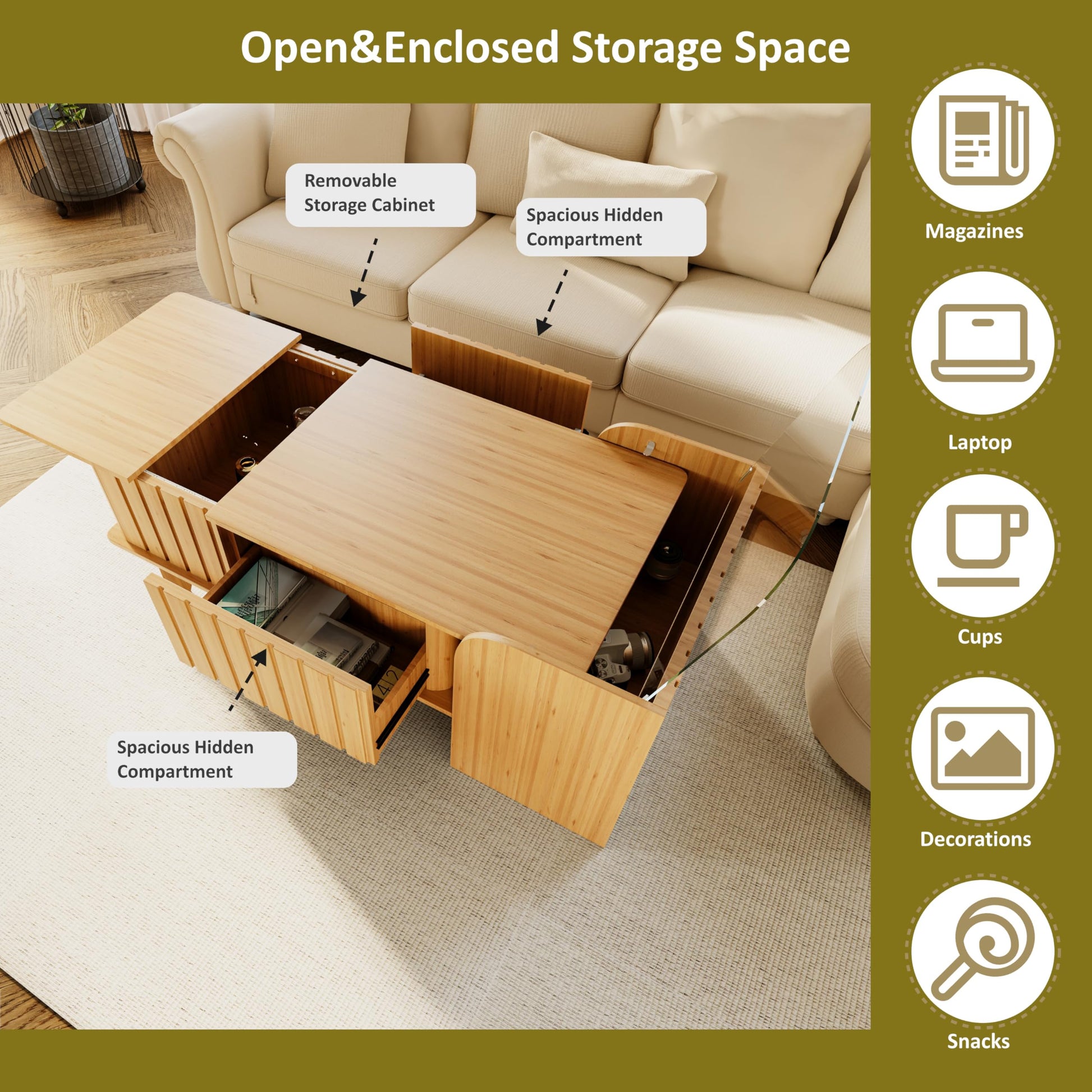 Jartoil Extendable Coffee Table with Storage, Wood Coffee Table with Hidden Compartment, Expandable Coffee Tables with Side Table for Living Home(Natural)